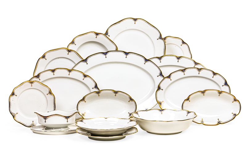 Il servizio per 8 persone più riserve, conta 54 pezzi ed è così composto: 9 piatti fondi (diametro cm 24); 27 piatti piani (diametro cm 24); 9 piatti da dessert (diametro cm 19,5); 1 insalatiera (altezza cm 6; diametro cm 26); 1 salsiera; 1 piatto da portata tondo (diametro cm 30); 4 piatti da portata ovali (cm 44x30; cm 38x29,5; cm 32,5x23); 2 vassoietti (cm 25x15)
