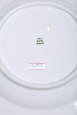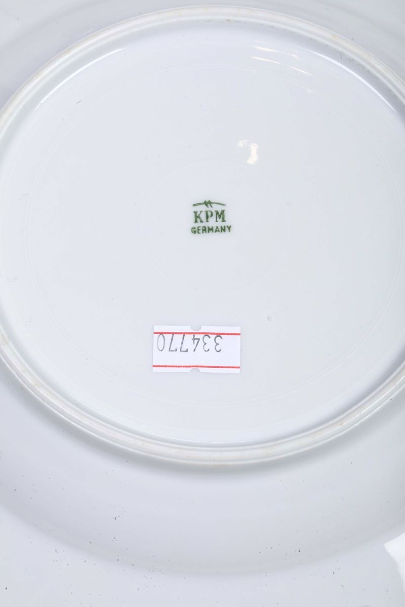 Porcellana. Marca: simbolo grafico con tre trattini e “KPM Germany” in verde. Conservazione: ottima; un piatto fondo con piccola sbeccatura e felatura al bordo