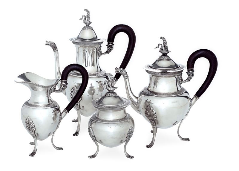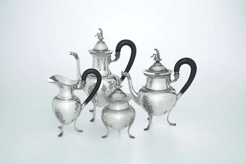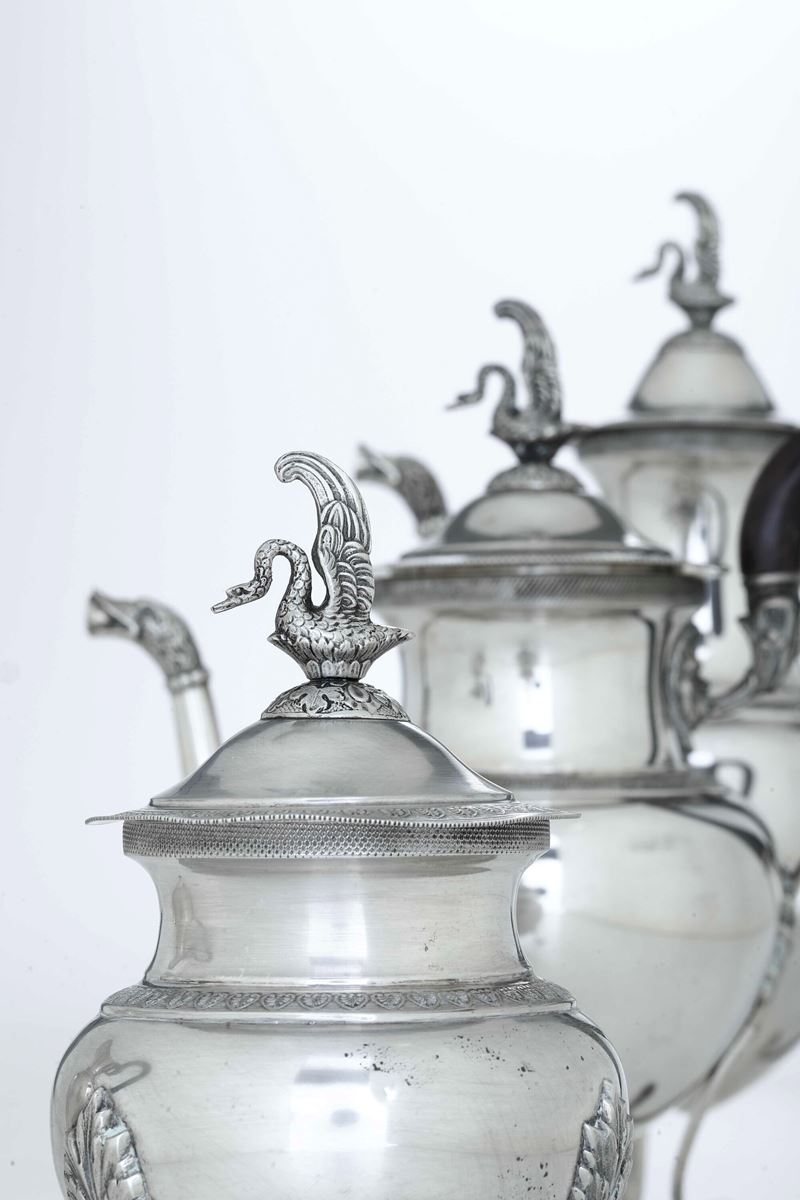 Servizio da tè e caffè di gusto neoclassico. Argenteria artistica fiorentina, marchi in uso dal 1935 al 1945. Argentiere Pampaloni