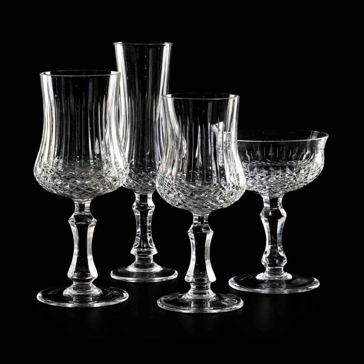 Il servizio per 12 persone conta 48 pezzi ed è così composto: 12 calici da acqua (altezza cm 17); 12 calici da vino (altezza cm 18); 12 coppe da champagne (altezza cm 13); 12 flûtes (altezza cm 20).