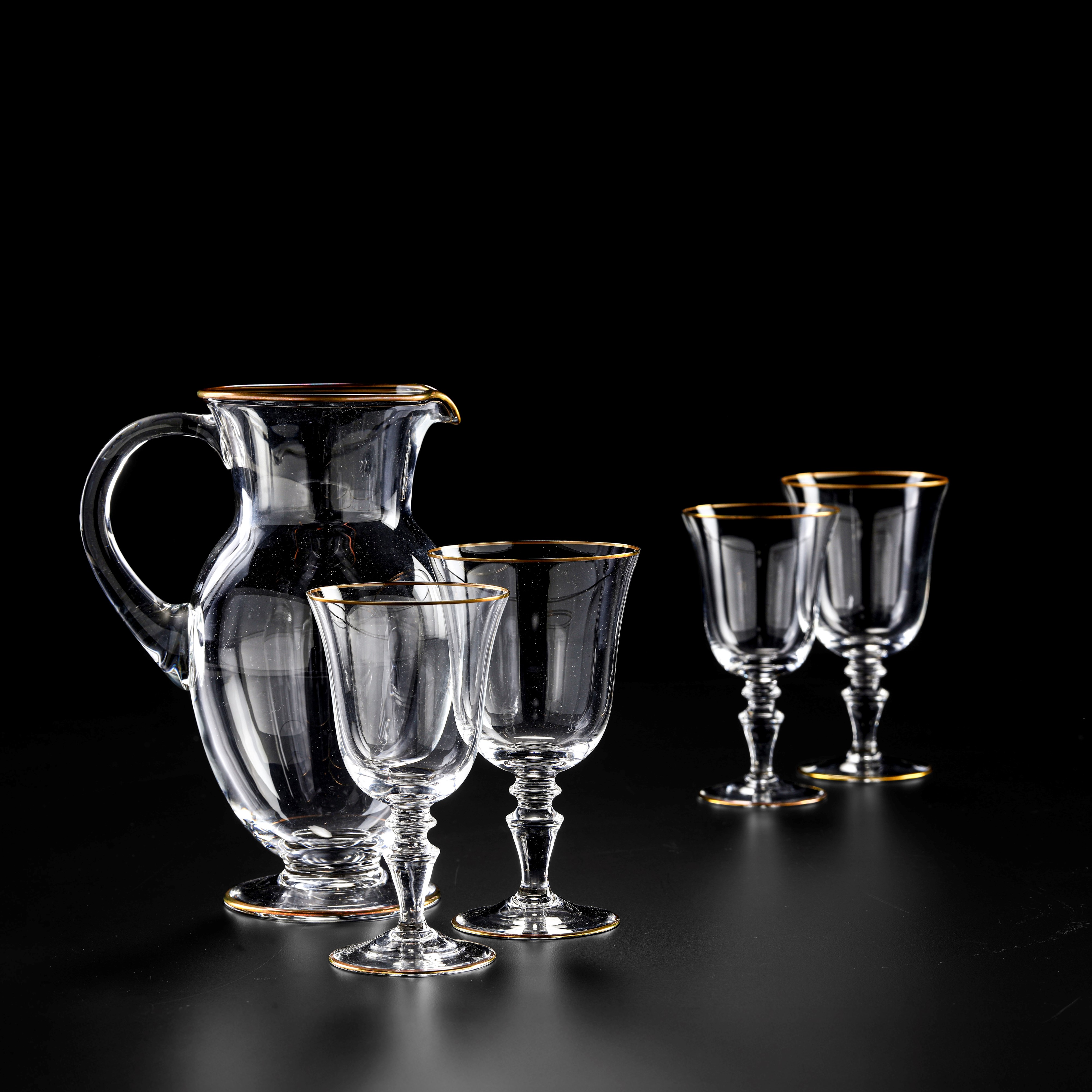 Il servizio per 12 persone conta 25 pezzi ed è composto da: 12 calici da acqua (altezza cm 16); 12 calici da vino (altezza cm 15); 1 brocca (altezza cm 22)