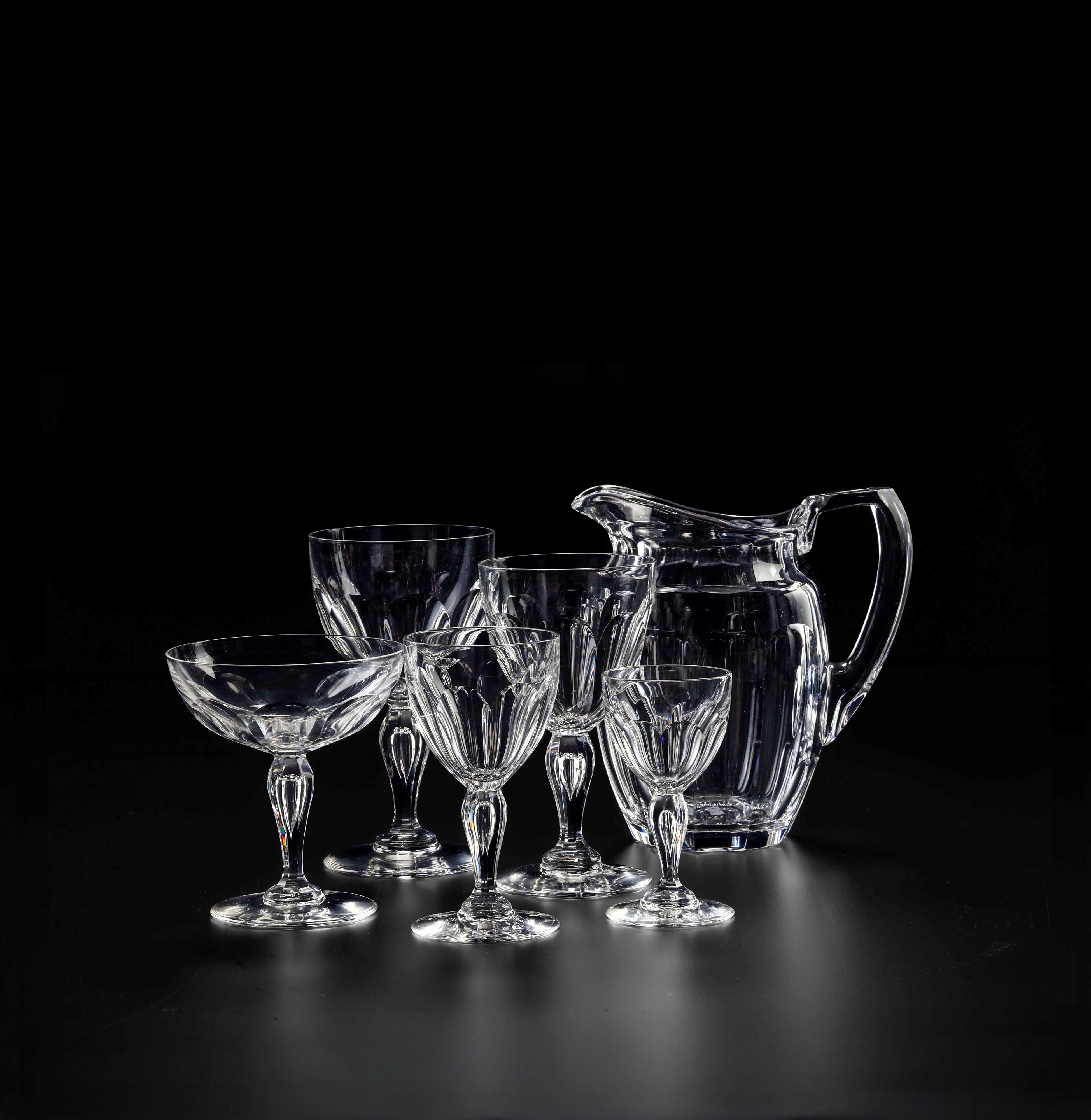Il servizio completo per 9 persone più riserve, conta 54 pezzi ed è composto da: 12 calici da acqua (altezza cm 16); 9 calici da vino rosso (altezza cm 15); 11 calici da vino bianco (altezza cm 13); 10 coppe da champagne (altezza cm 11,5); 10 calici da rosolio (altezza cm 10,5); 2 caraffe (altezza cm 17)
