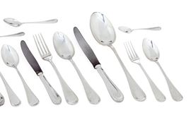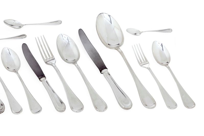 composto da 1 cucchiaio grande, 12 cucchiaini da caffè, 12 cucchiaini dolce, 13 cucchiai medi, 12 cucchiai minestra, 18 forchette, 12 coltelli, 13 forchette frutta, 13 coltelli piccoli
