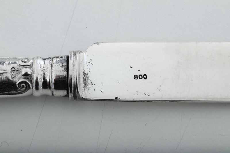 composto da: 24 forchette,36 coltelli e 18 cucchiai grandi,17 forchette,18 coltelli e 18 cucchiai da frutta,17 cucchiaini da tè e 8 posate da portata. le lame dei coltelli da frutta sono in argento 800