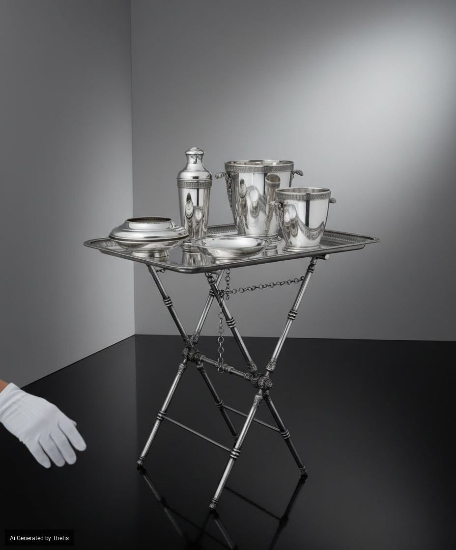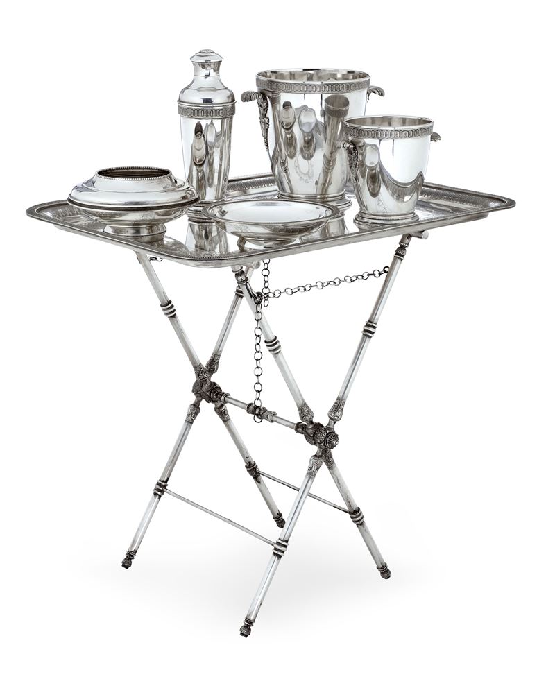 lotto composto da vassoio su cavalletto (rispettivamente grammi 5000 e 4000) e da portaghiaccio, porta champagne, shaker e vasellame (peso gr 4000)