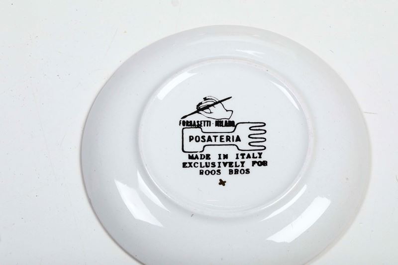 Porcellana. Marca: “Fornasetti Milano Made in Italy Exclusively for Roos Bros” e “Posateria” in nero”. Diametro cm 10. Conservazione: ottima; leggere usure all’oro; scatola originale