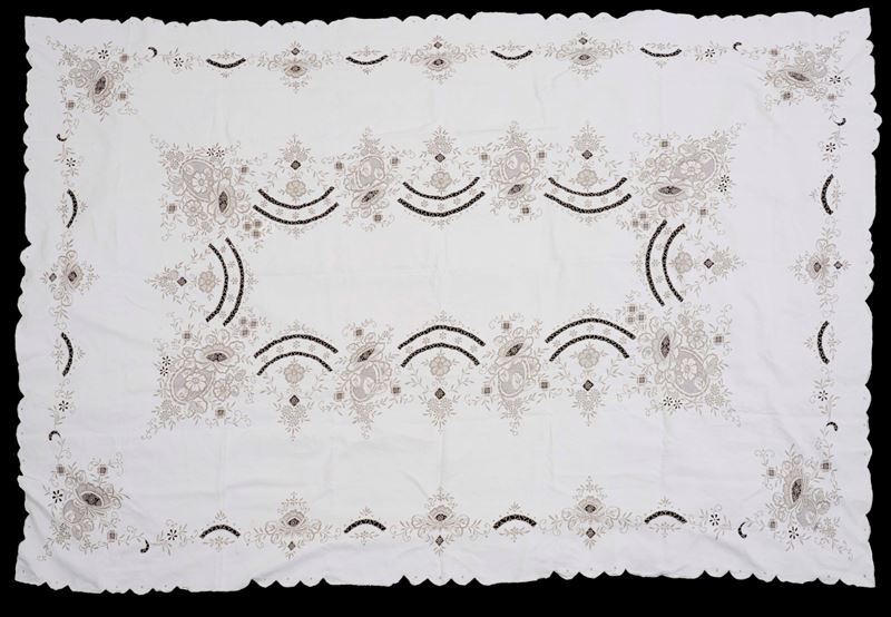 Raffinata tovaglia in lino color ecrù decorata ad intaglio ed eleganti ricami floreali a punto pieno in filo grigio perla
