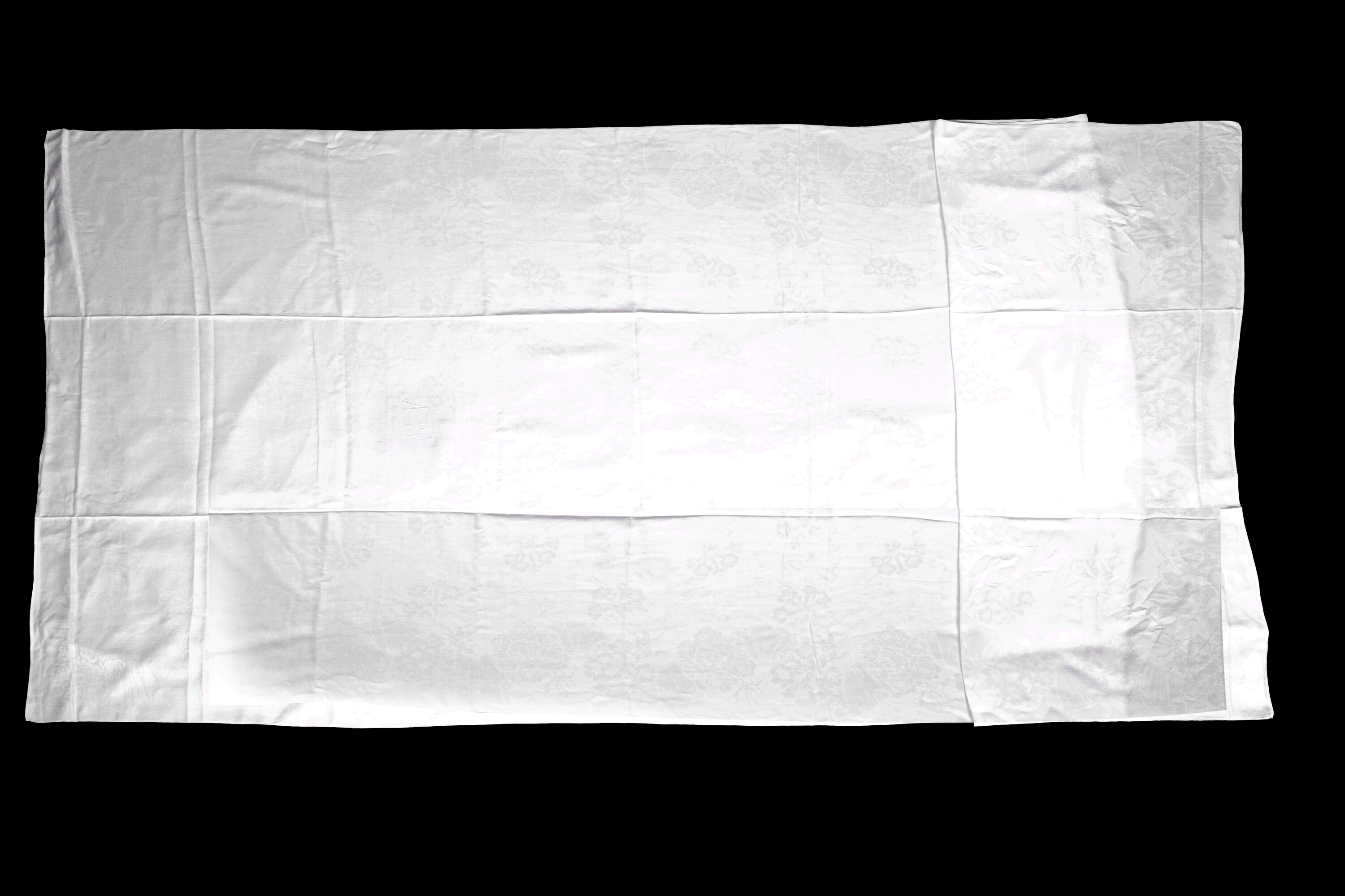 Pregiata tovaglia di fiandra in cotone bianco arricchita da decorazioni floreali tessute con effetto lucido-opaco