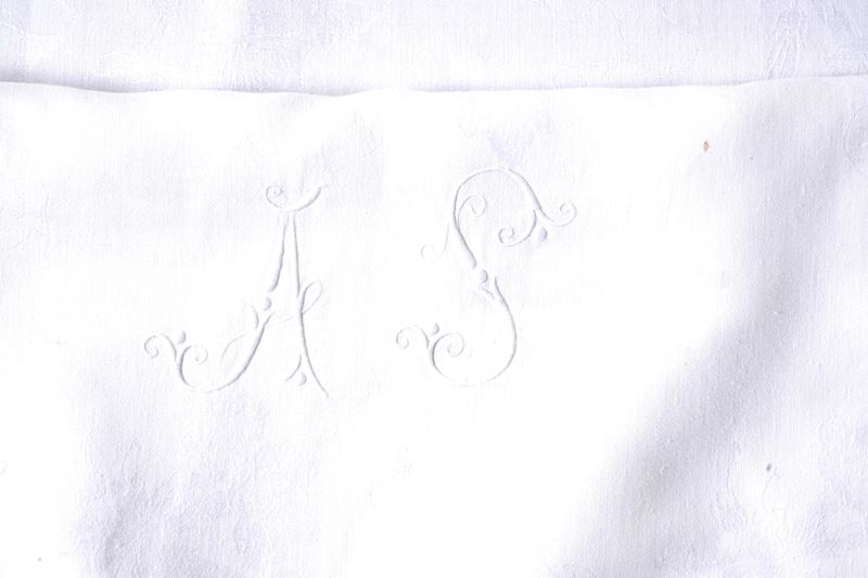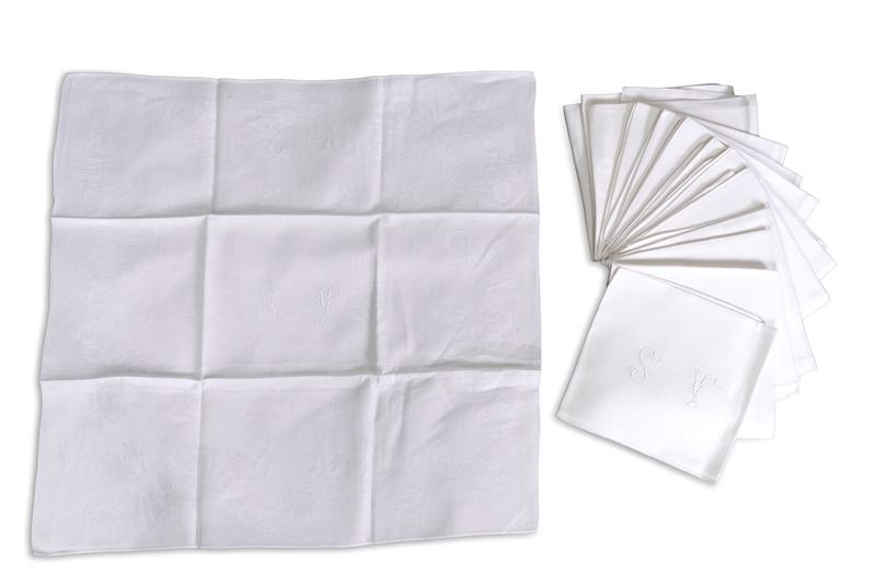 Dimensioni: tovaglia (cm 405x177); tovagliolo (cm 62x62). Conservazione: ottima