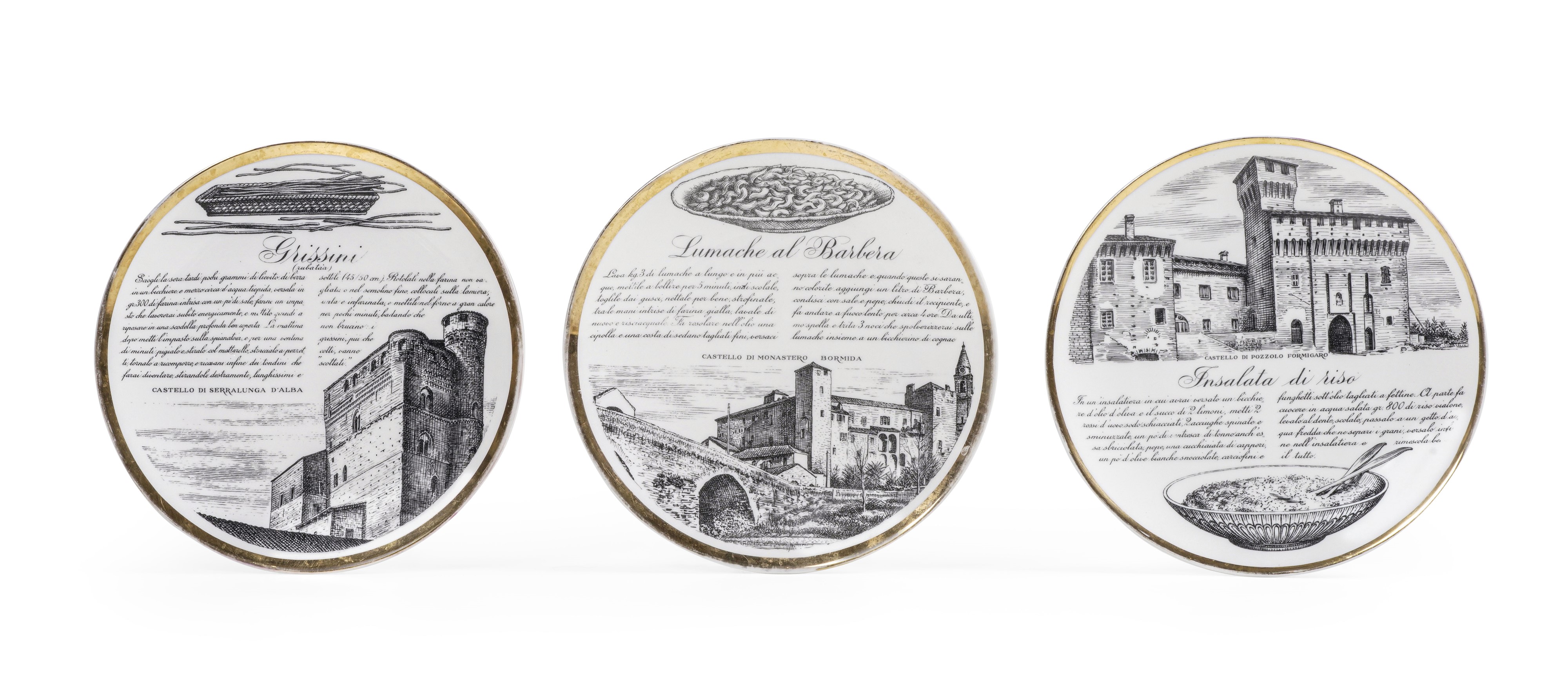 Tre piatti “Specialità Torinesi” Milano, Piero Fornasetti (1913-1988), 1970 circa