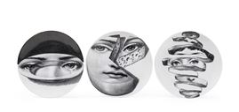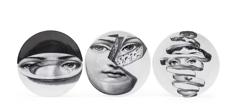 Tre piatti “Tema e Variazioni” Milano, Piero Fornasetti (1913-1988), terzo quarto del XX secolo