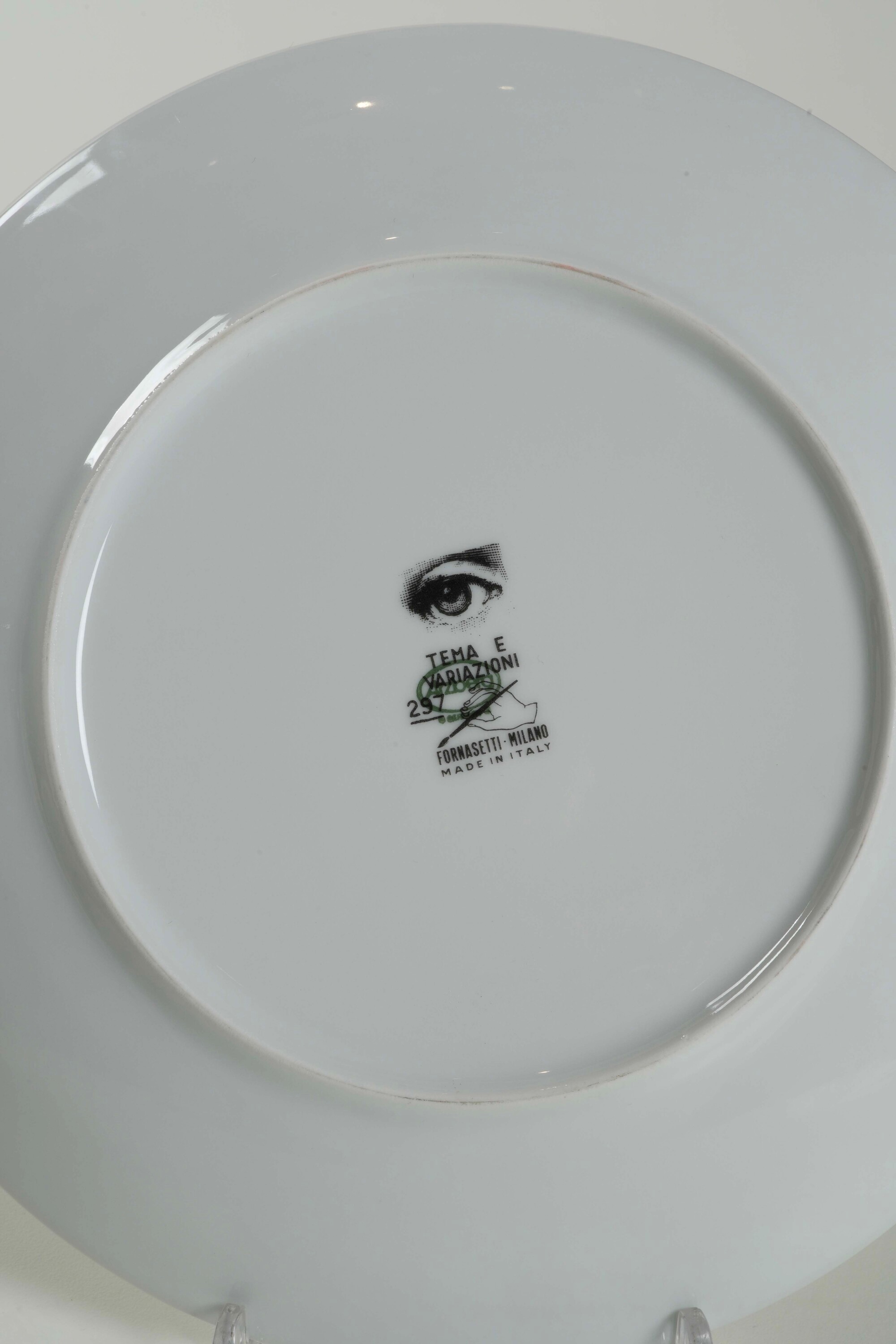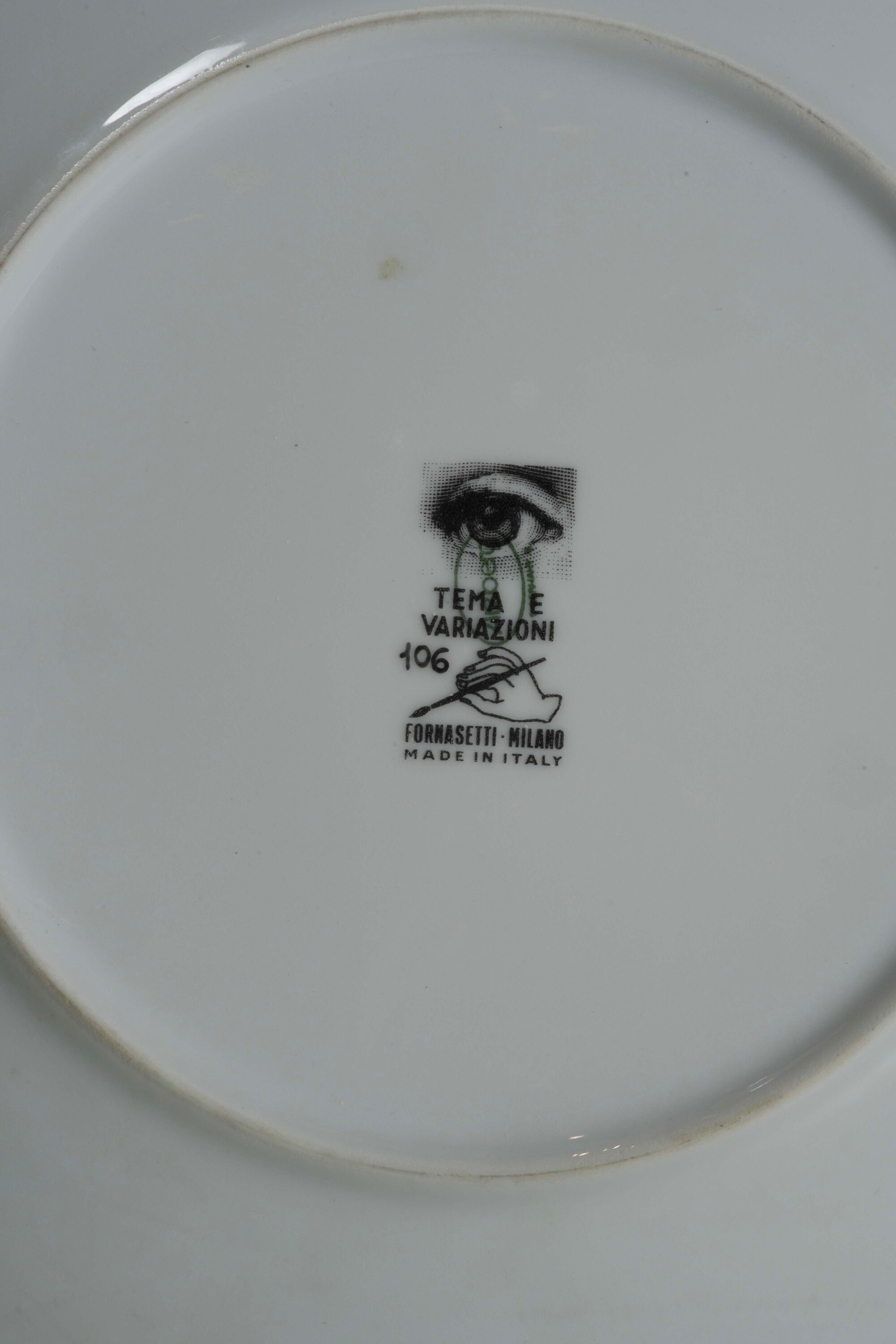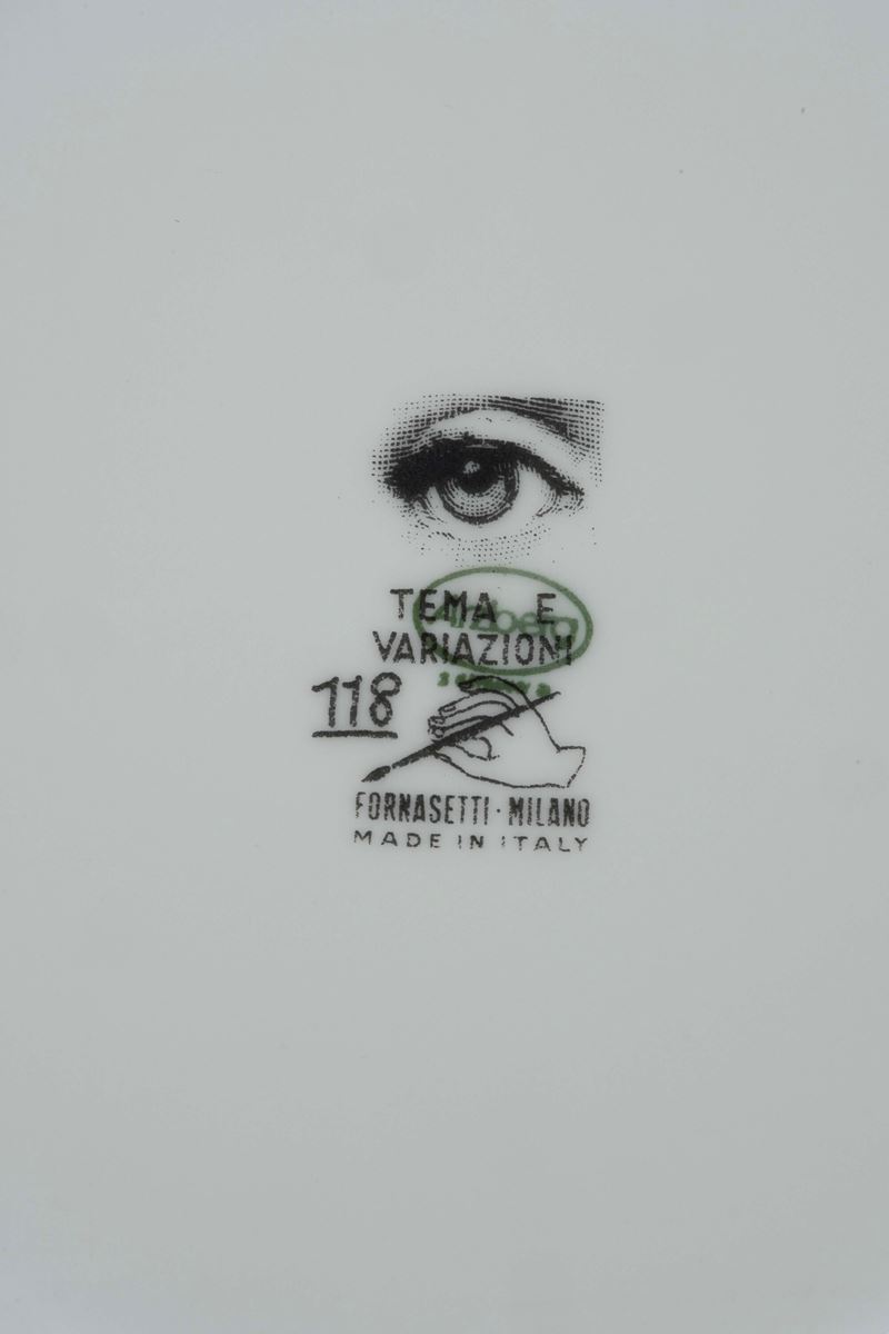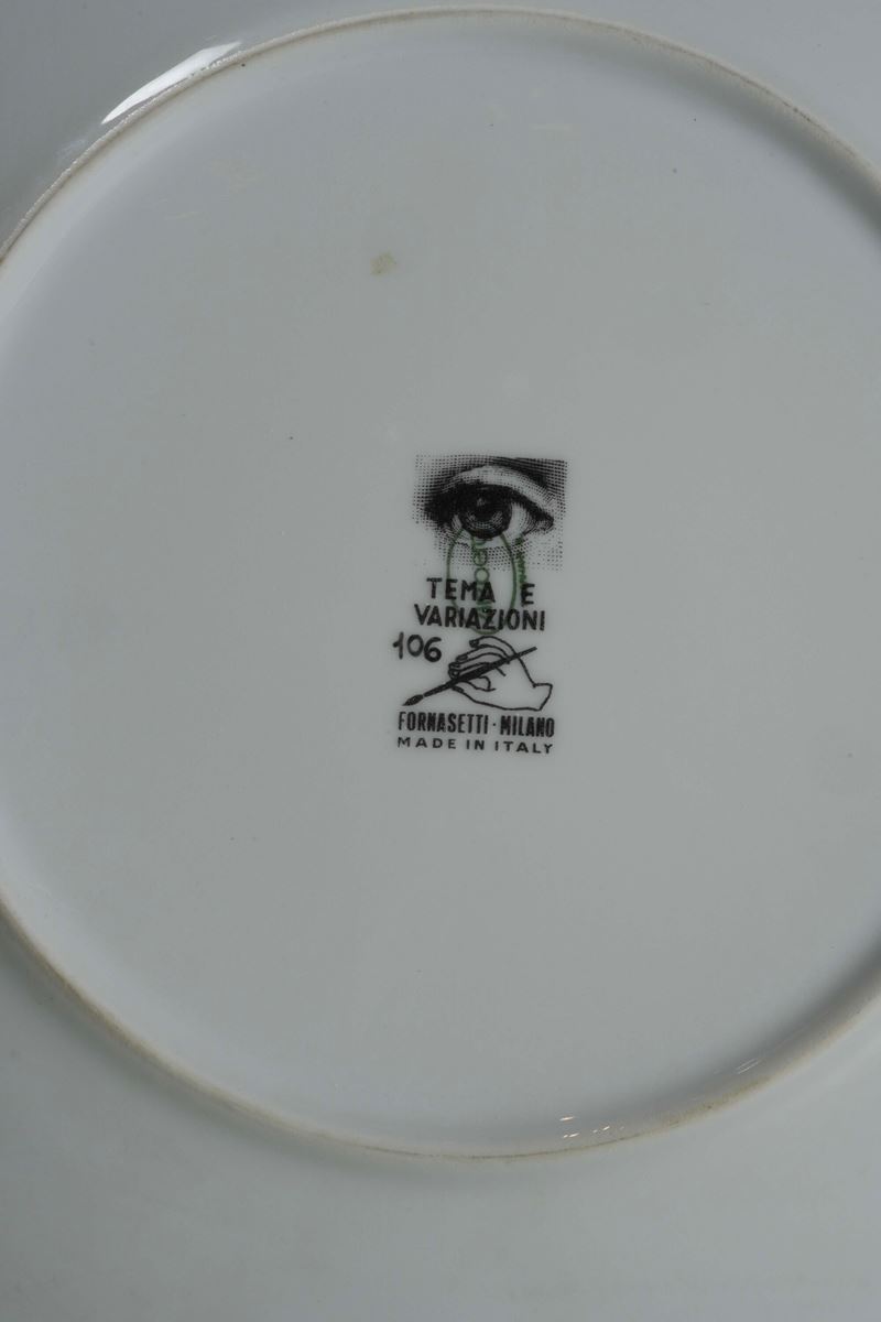 Porcellana. Marca: simbolo grafico con “Tema e Variazioni”, “Fornasetti Milano”. Diametro cm 25,2. Conservazione: ottima. Scatole originali