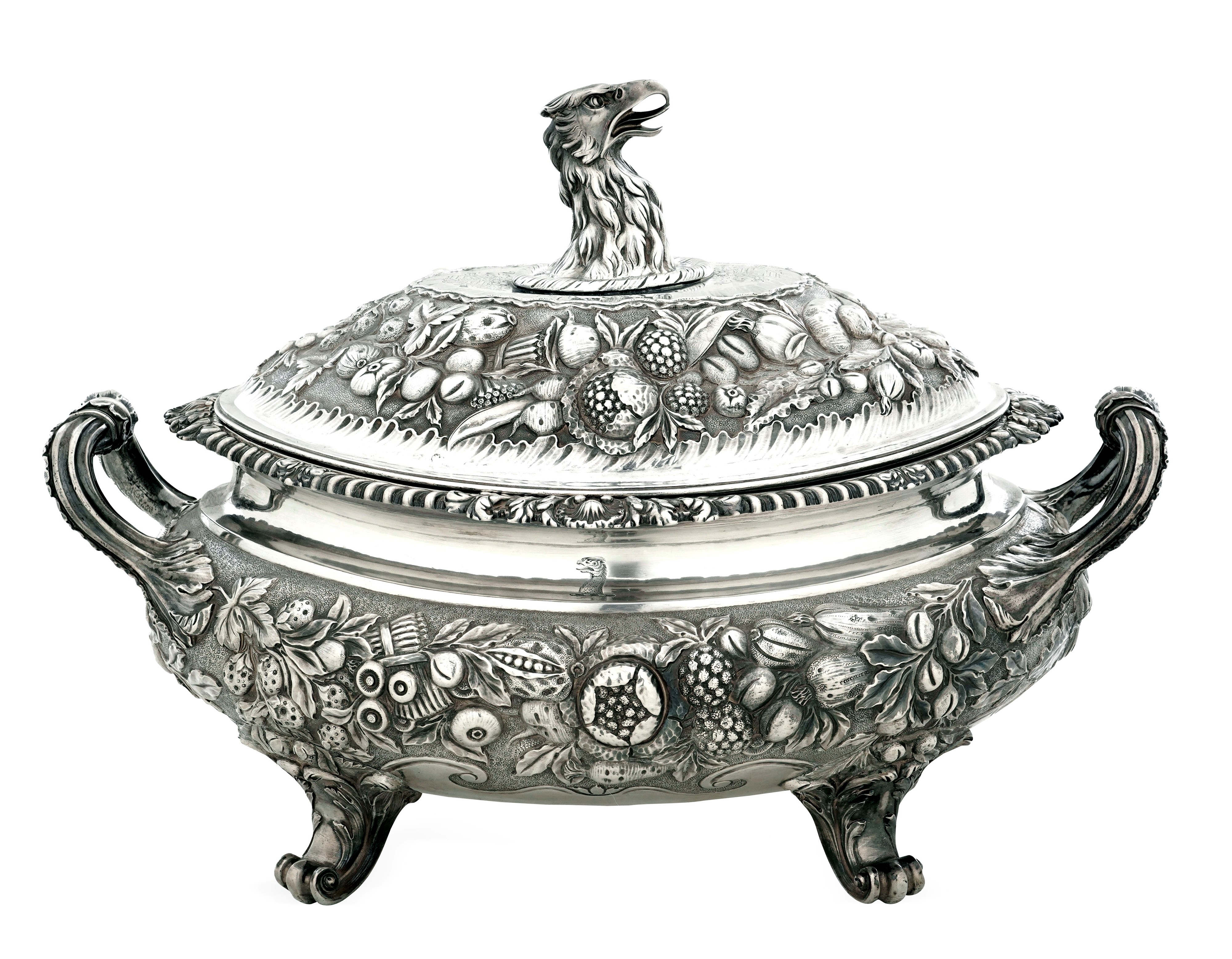 Corpo ovale biansato poggiante su piedi a ricciolo e presa a foggia di testa di grifo. Fasce con ricchi decori a frutti sbalzati