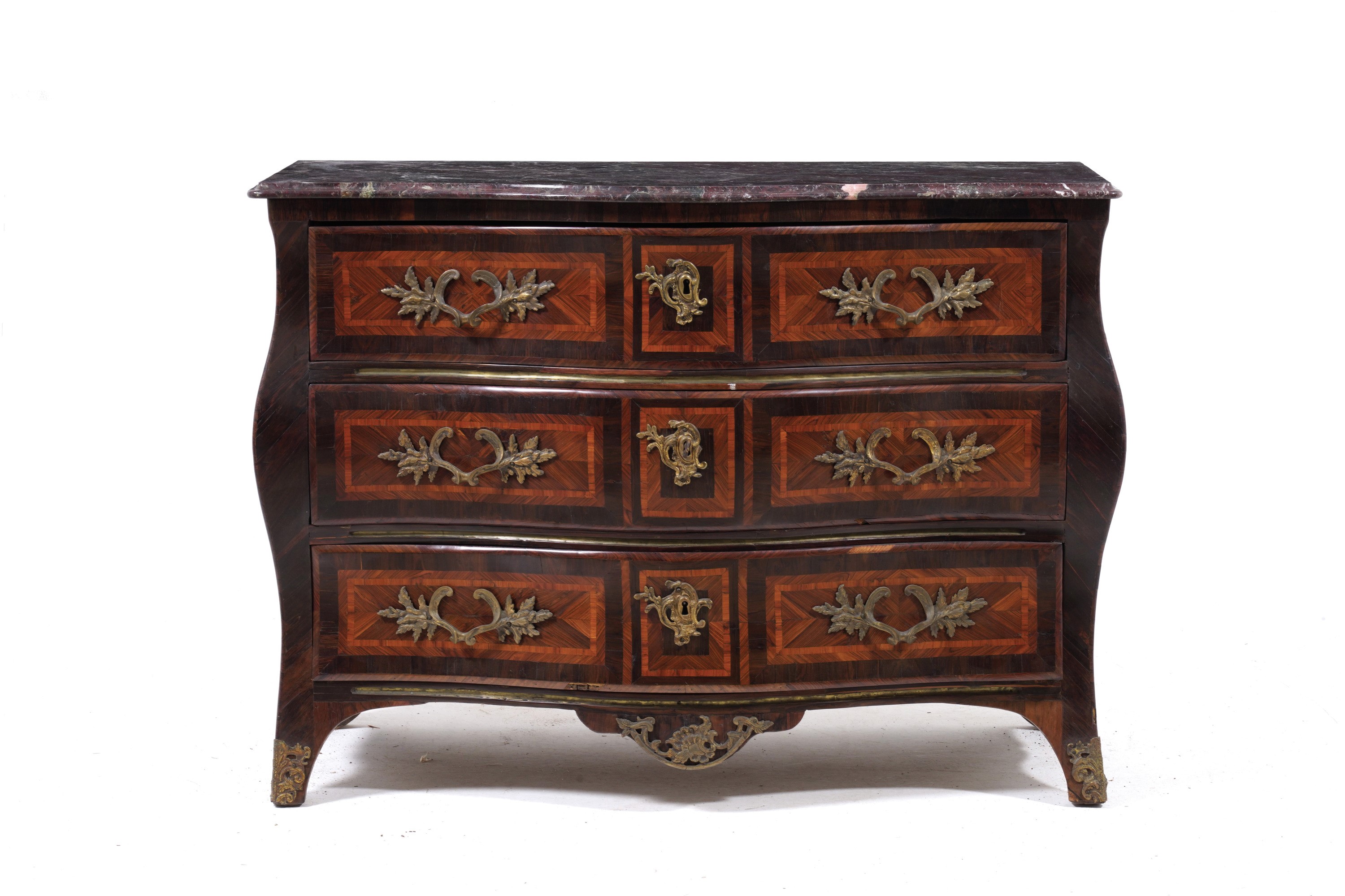 Lastronata in palissandro, decorata con pannelli ornamentali intarsiati con diversi legni pregiati, fronte mosso a tre cassetti con maniglie e boccachiavi in bronzo dorato. Piano in marmo modanato (rotture)