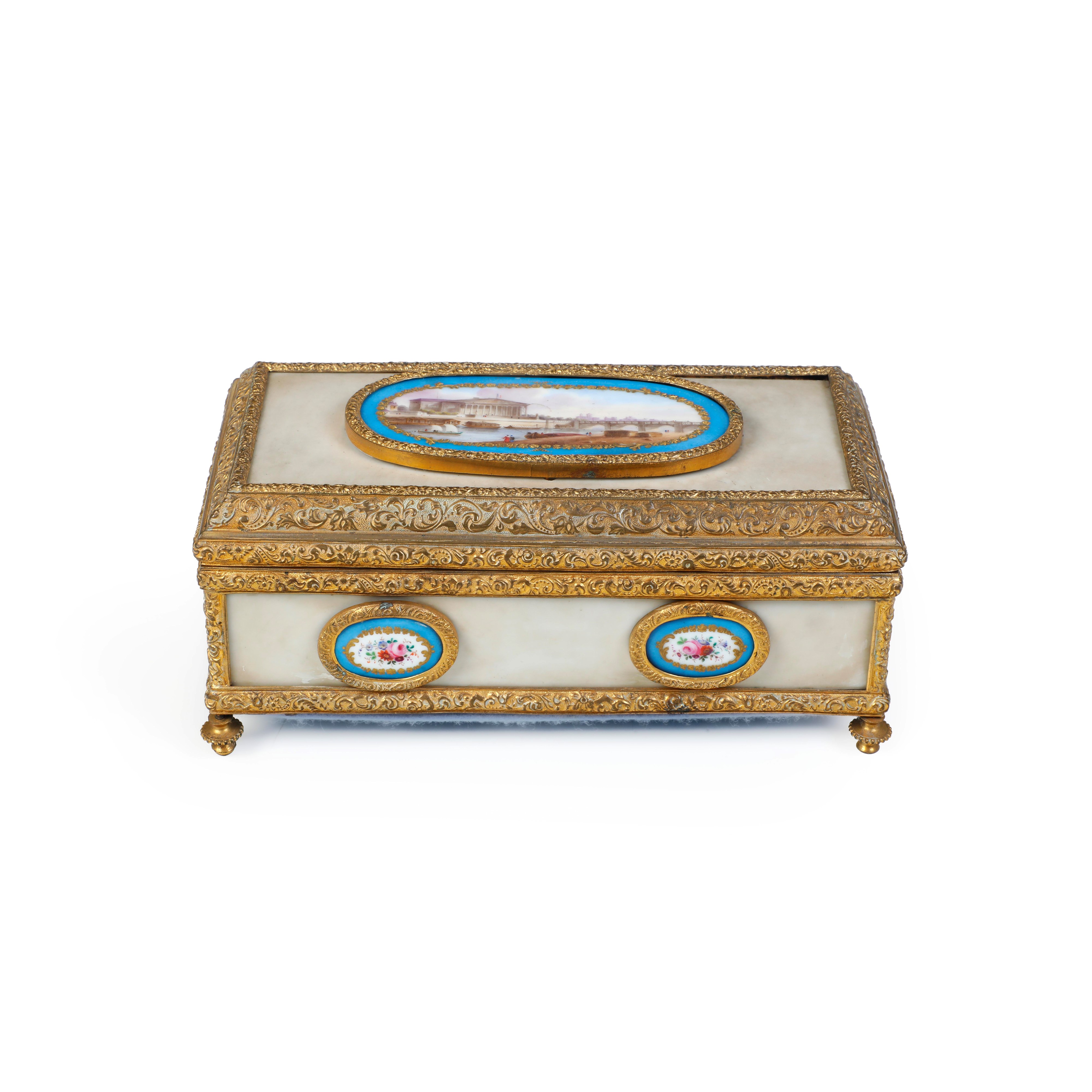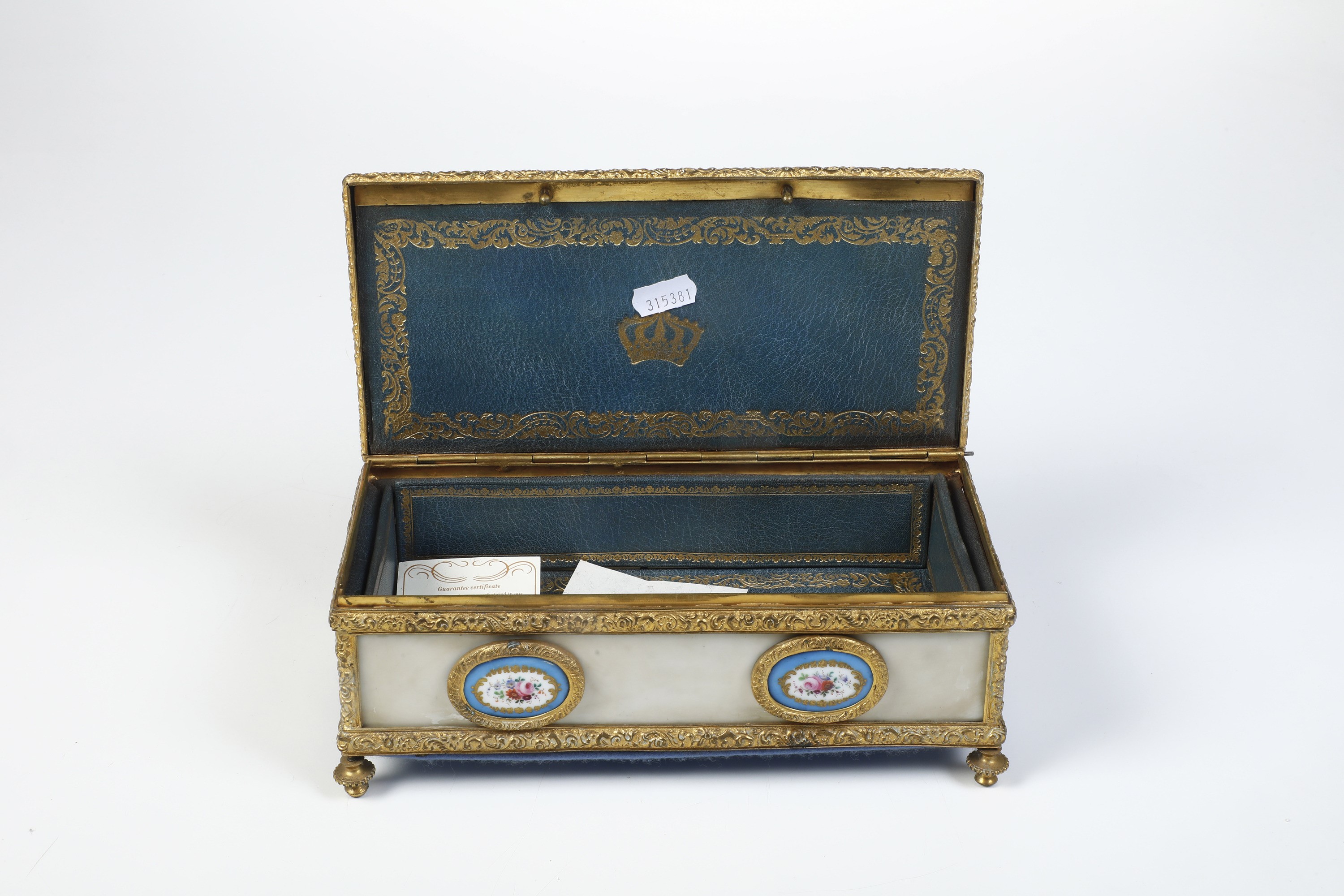 Decorato con placche in porcellana policroma con fiori e un paesaggio. Struttura e profili in metallo dorato