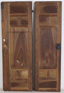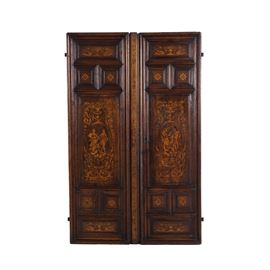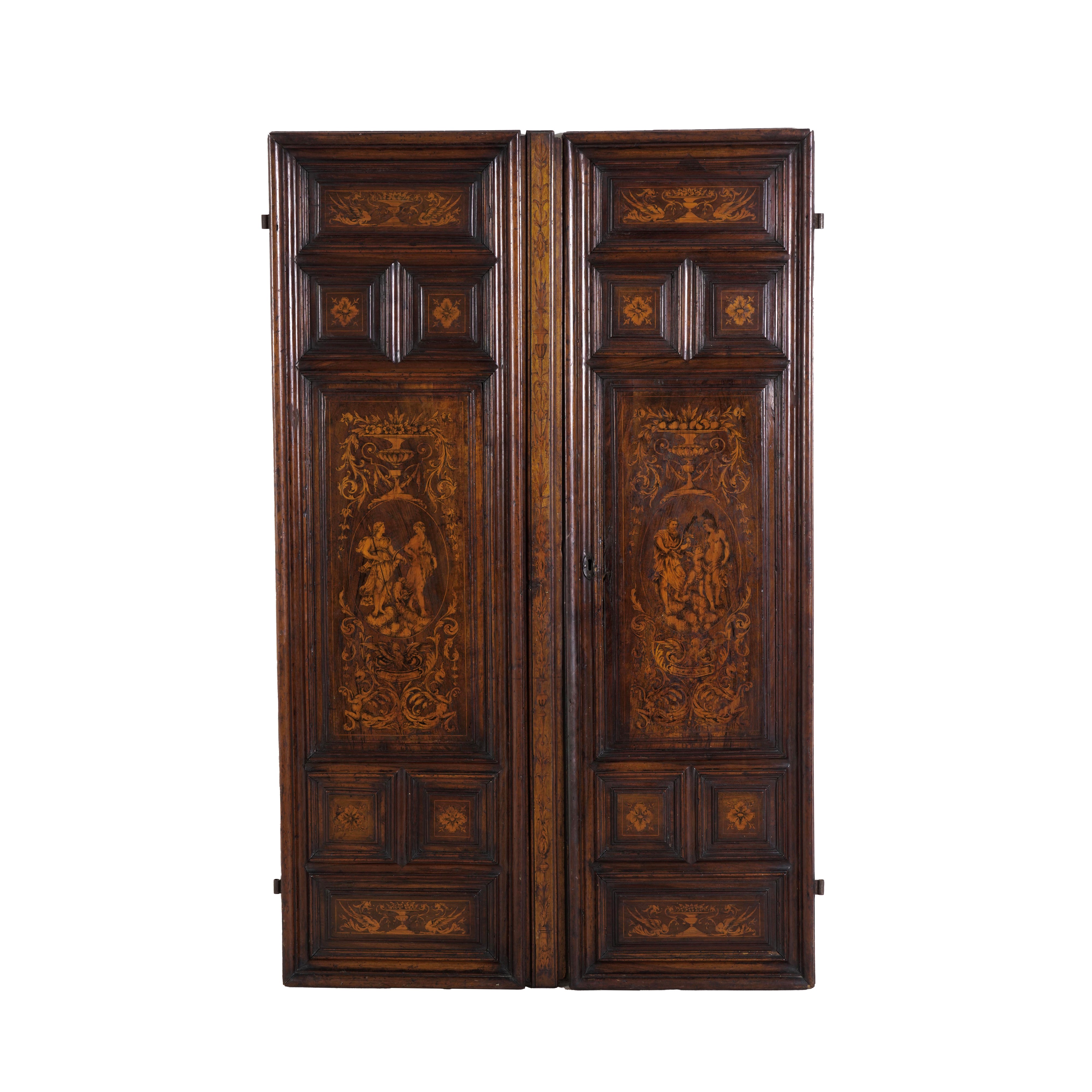 Coppia di ante pannellate in legno intarsiato. XIX-XX secolo