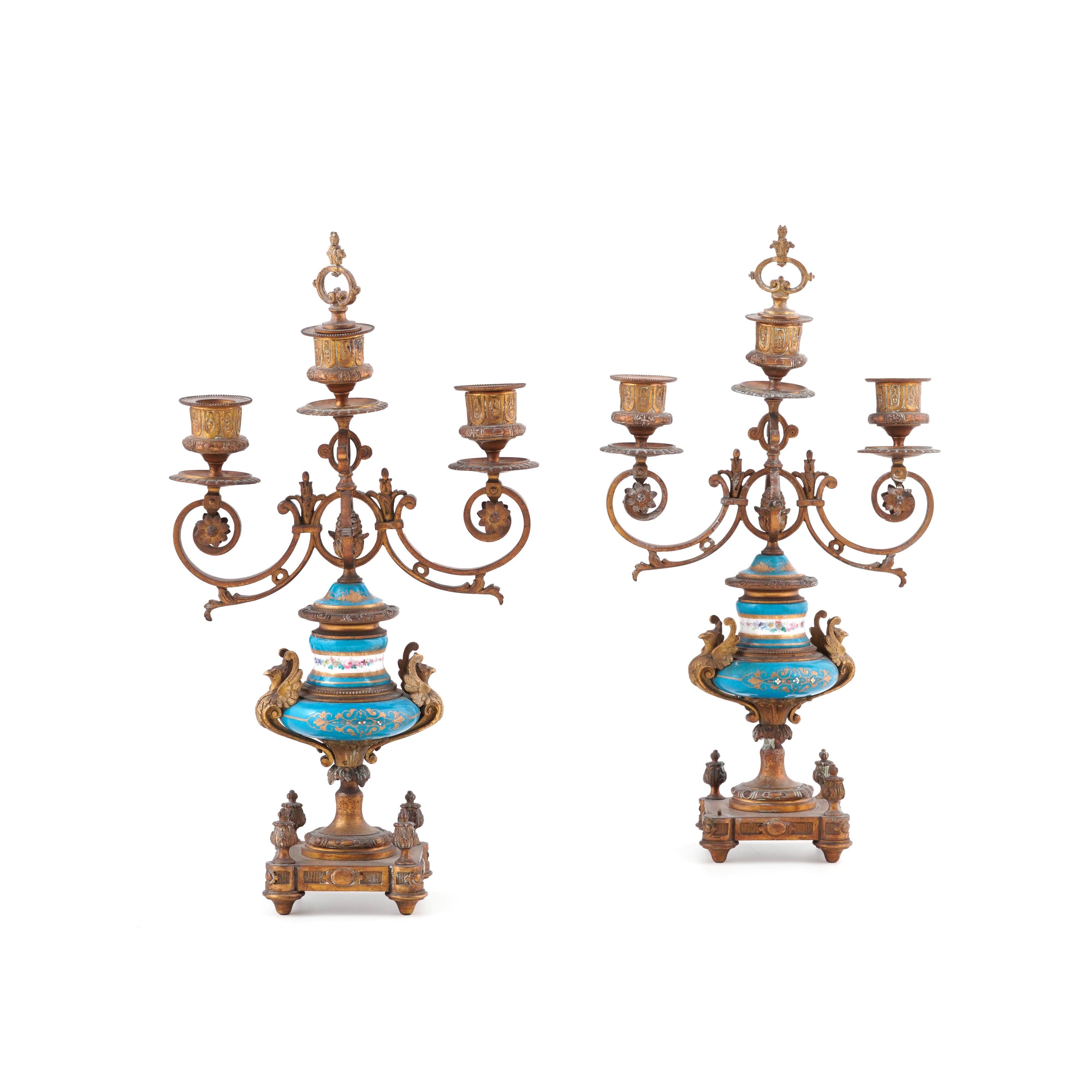 Coppia di candelieri in metallo dorato e maiolica. Francia, XIX secolo