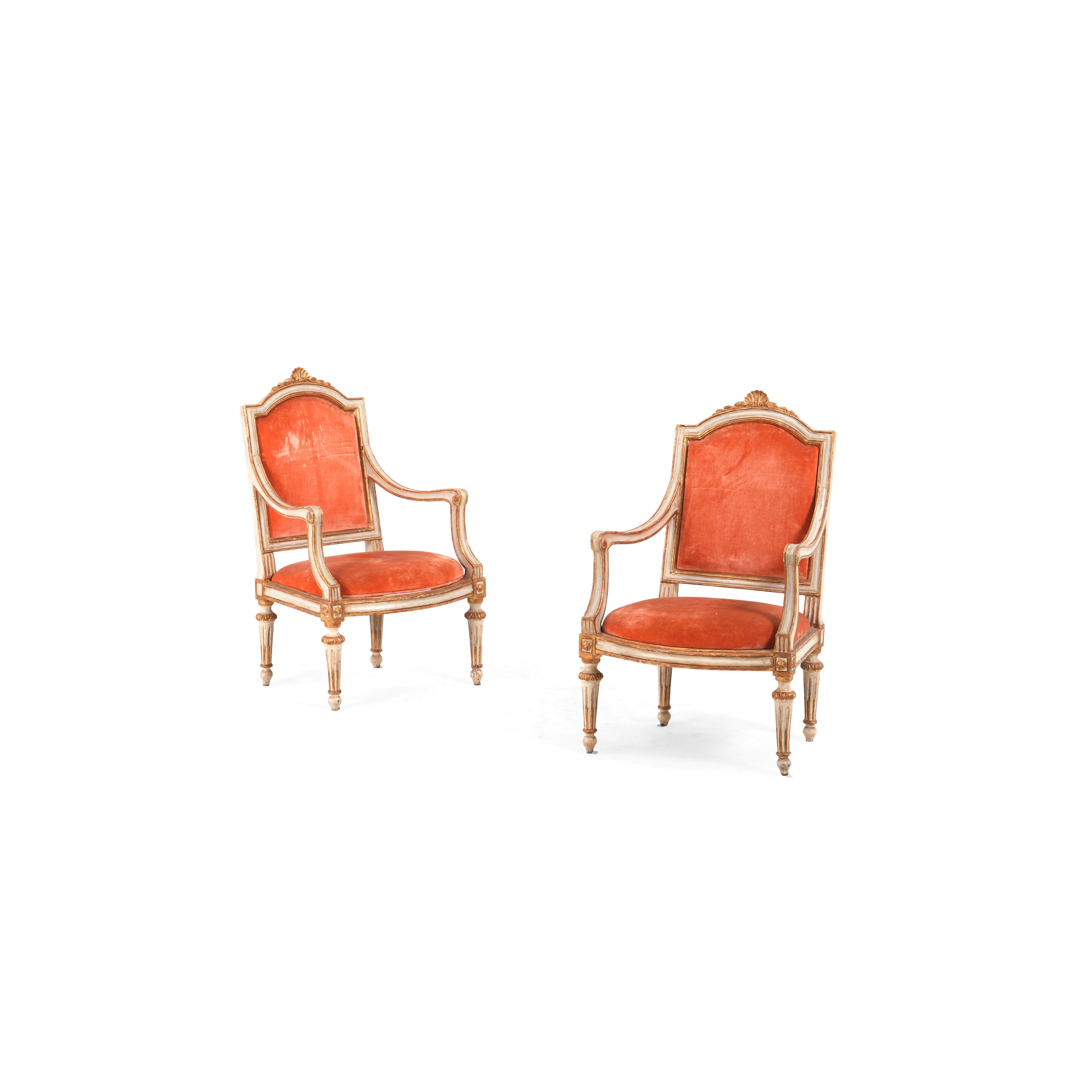 Coppia di poltrone Luigi XVI in legno intagliato, laccato e dorato. Fine XVIII-XIX secolo