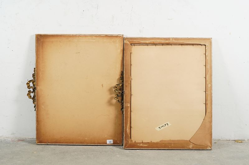 Coppia di incisioni colorate. Entro cornici