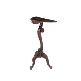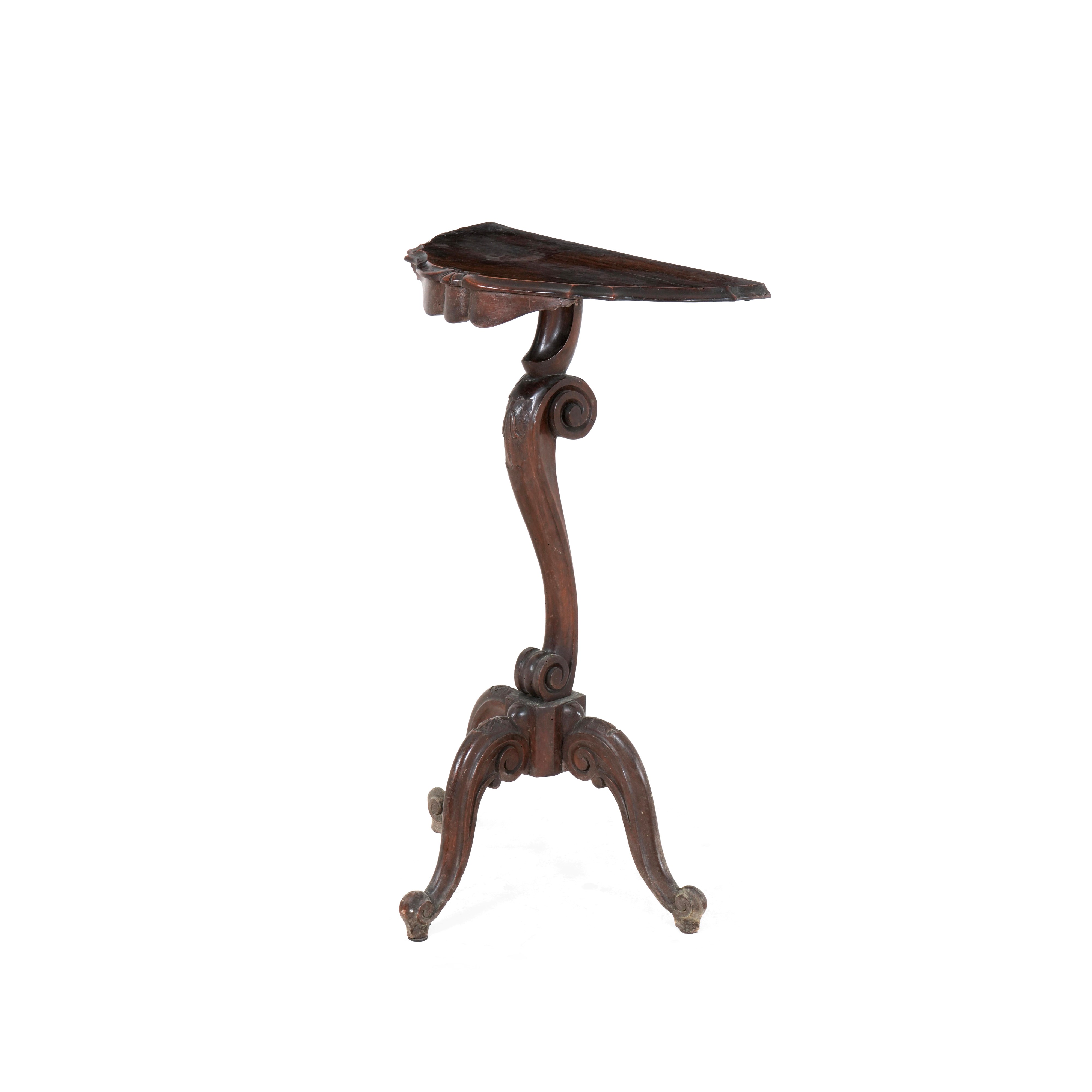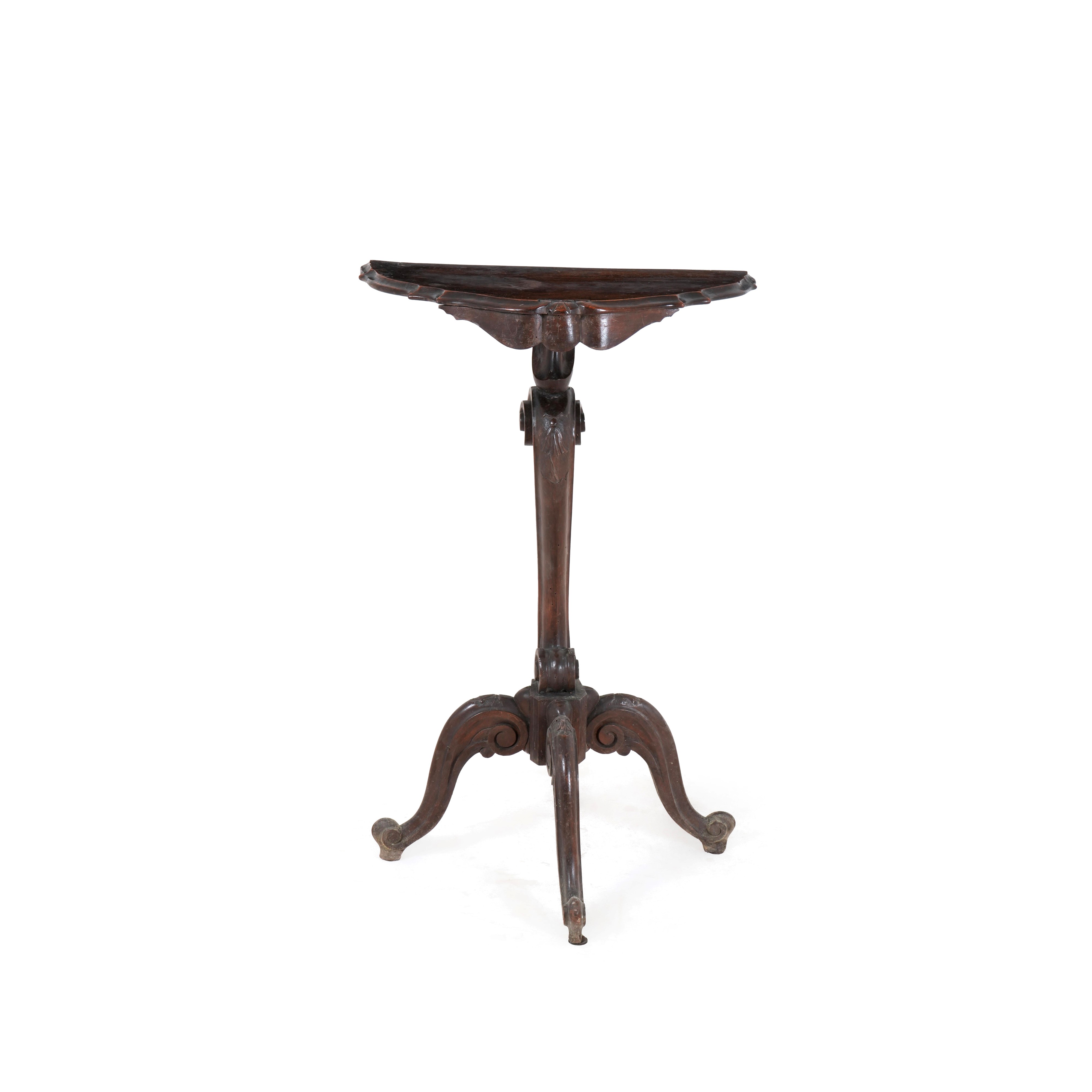 Tripode, fusto a voluta, piano modanato e sagomato, decori fitomorfi a rilievo