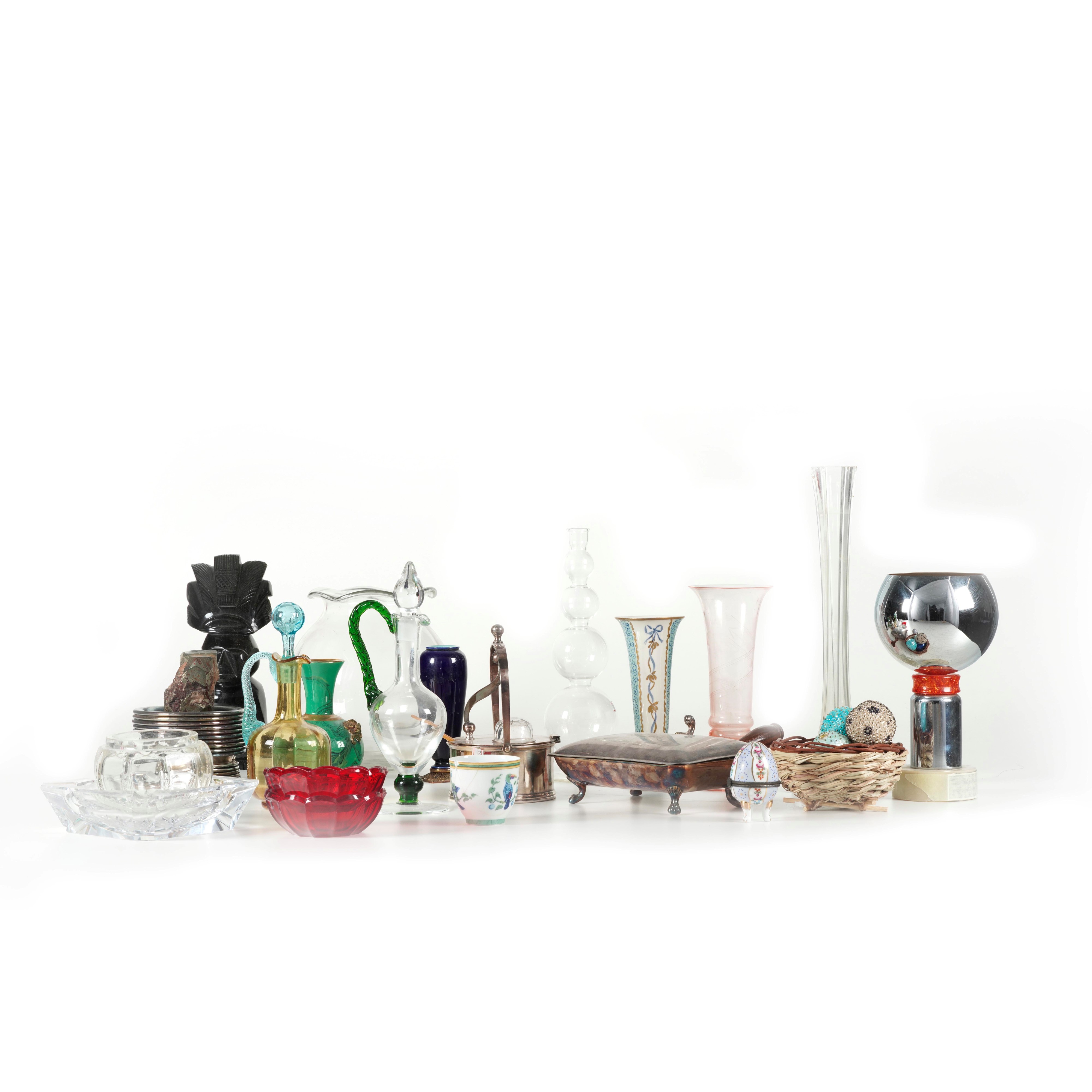 Il lotto comprende, tra l'altro, vasi in vetro, brocche in vetro con tappo, posacenere in vetro e in metallo e una coppa