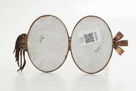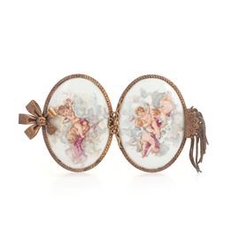 Pendente in metallo dorato con coppia di miniature in porcellana di Limoges raffiguranti cherubini
