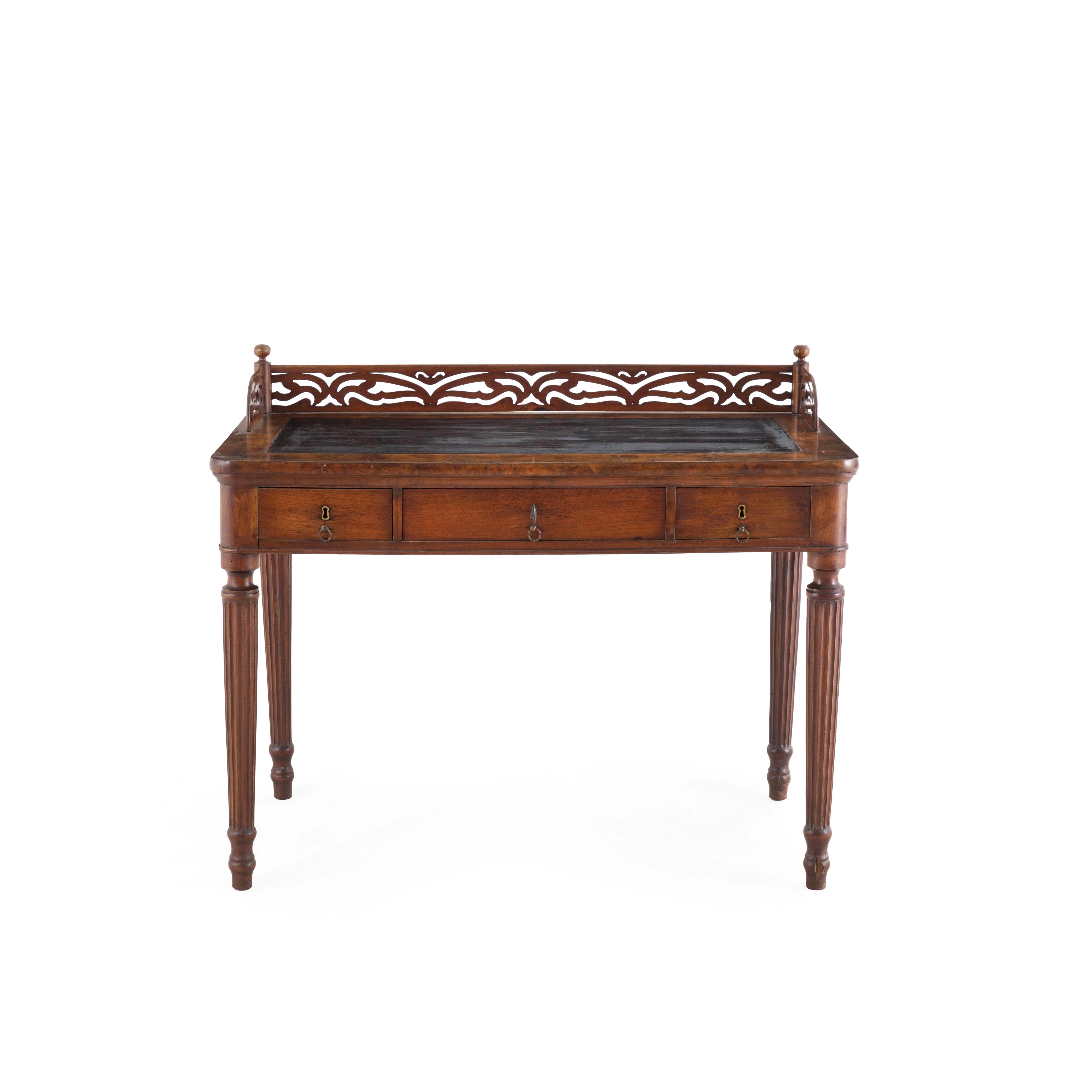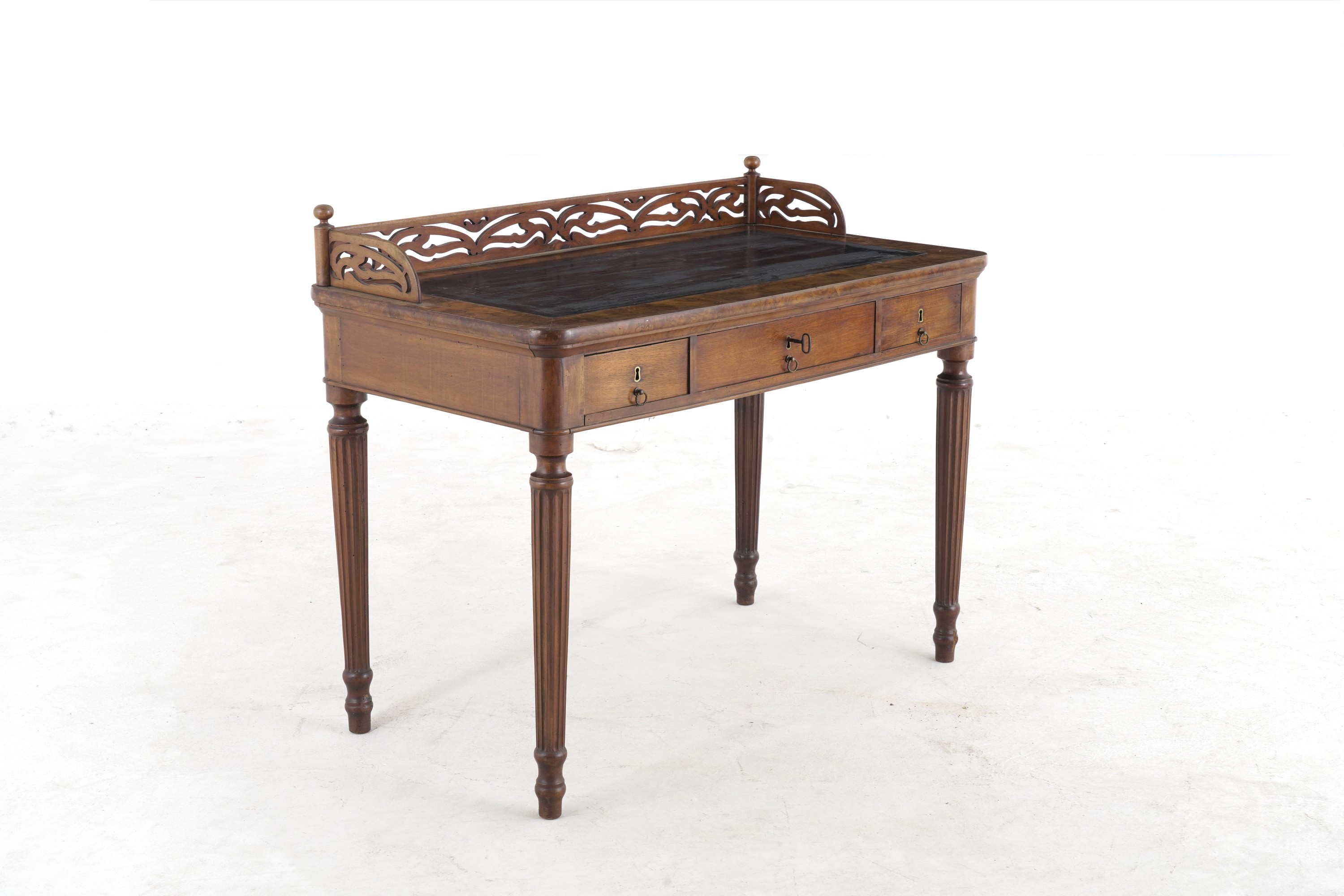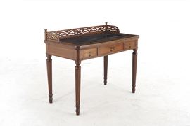 Fascia a tre cassettini affiancati, piano foderato in cuoio con bordo traforato, gambe tronconiche scanalate