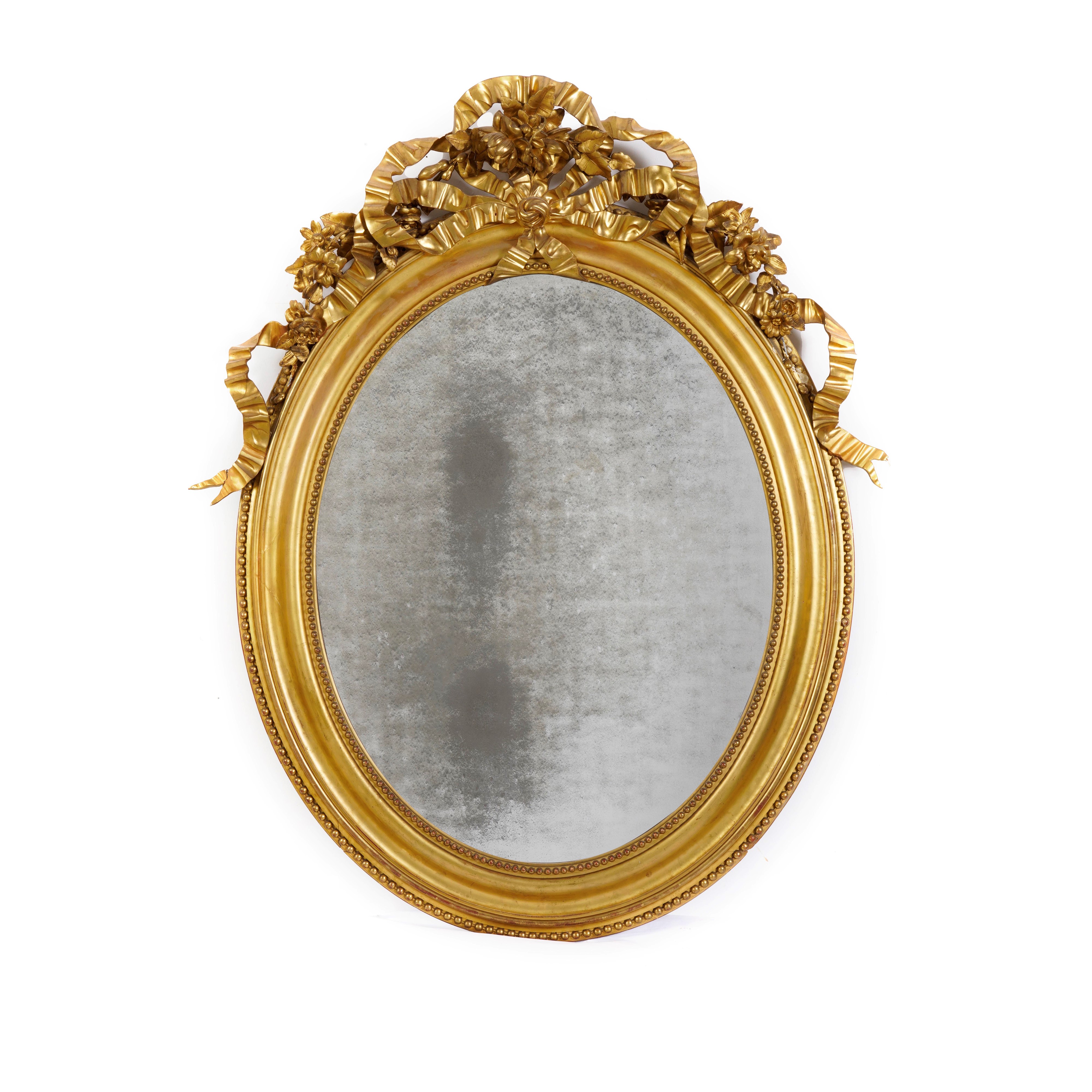 Specchiera ovale dorata in legno intagliato e pastiglia. XIX-XX secolo