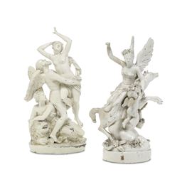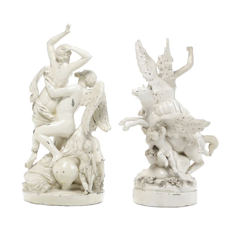Terraglia. Marca: assente. Dimensioni: Altezza cm 37,7; cm 34,8. Conservazione: gruppo del Tempo, buona, un’ala del putto mancante, alcune dita della mano sinistra della Bellezza in parte mancanti o restaurate; qualche caduta di smalto; l’altro gruppo con braccio destro dell’Aurora, coda del cavallo, un’ala di ogni putto e una mano restaurati, cadute di smalto e mancanze minori