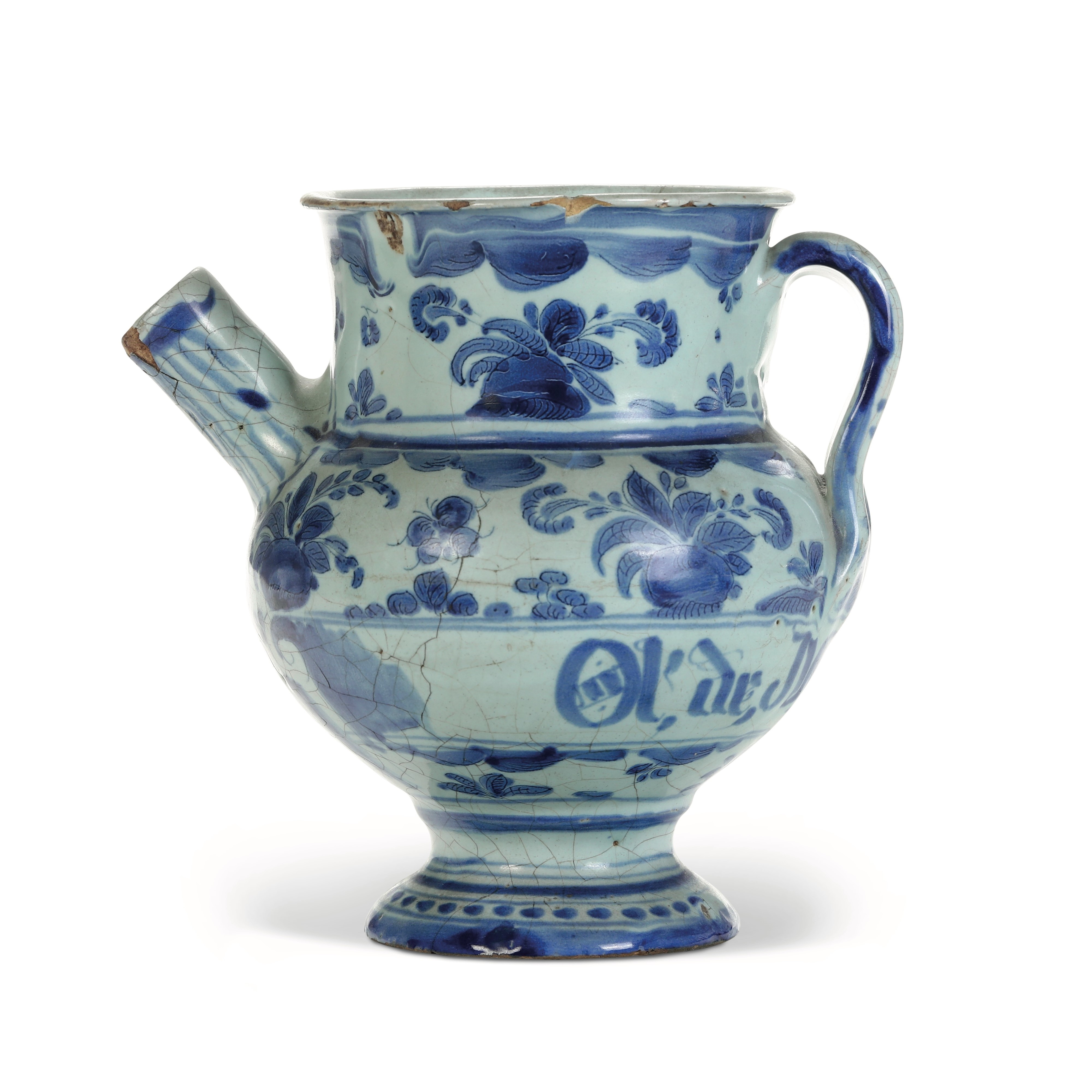Maiolica. Marca: stemma di Savona con lettere “BA” in blu. Altezza cm 18,6. Conservazione: qualche piccola sbeccatura e caduta di smalto al bordo superiore e al beccuccio; felatura al corpo e craquellures