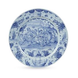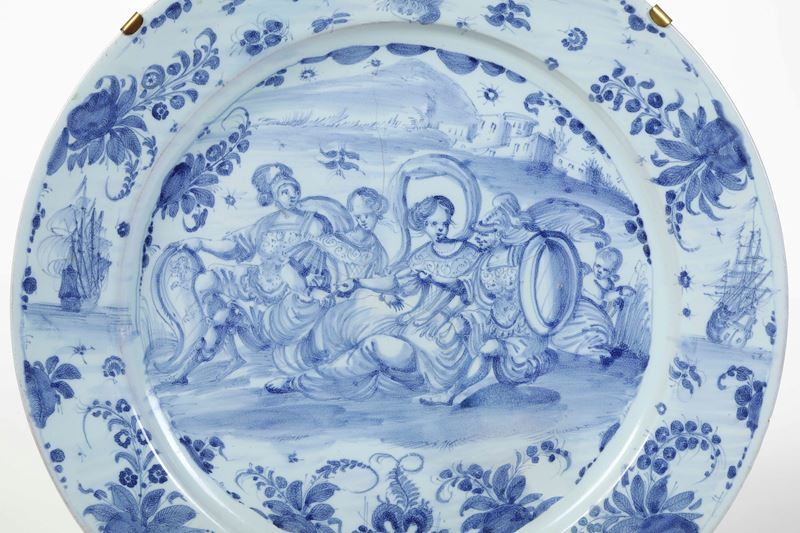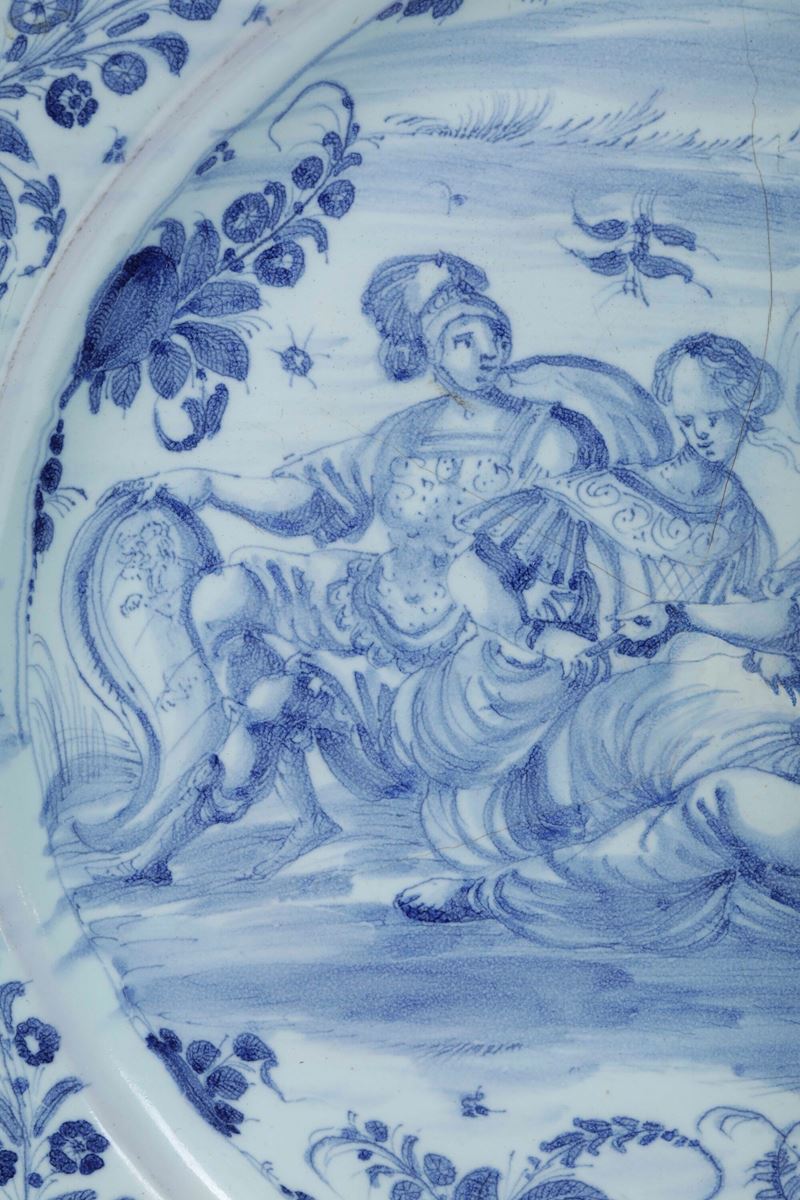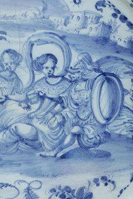 Si tratta di una formula narrativa diffusa nel repertorio iconografico della maiolica ligure di età barocca, resa originale dall’adozione di abiti femminili di foggia contemporanea, riprodotti in maniera del tutto riconoscibile, secondo una scelta che ha permesso di scoprire altri lavori dello stesso pittore (1).