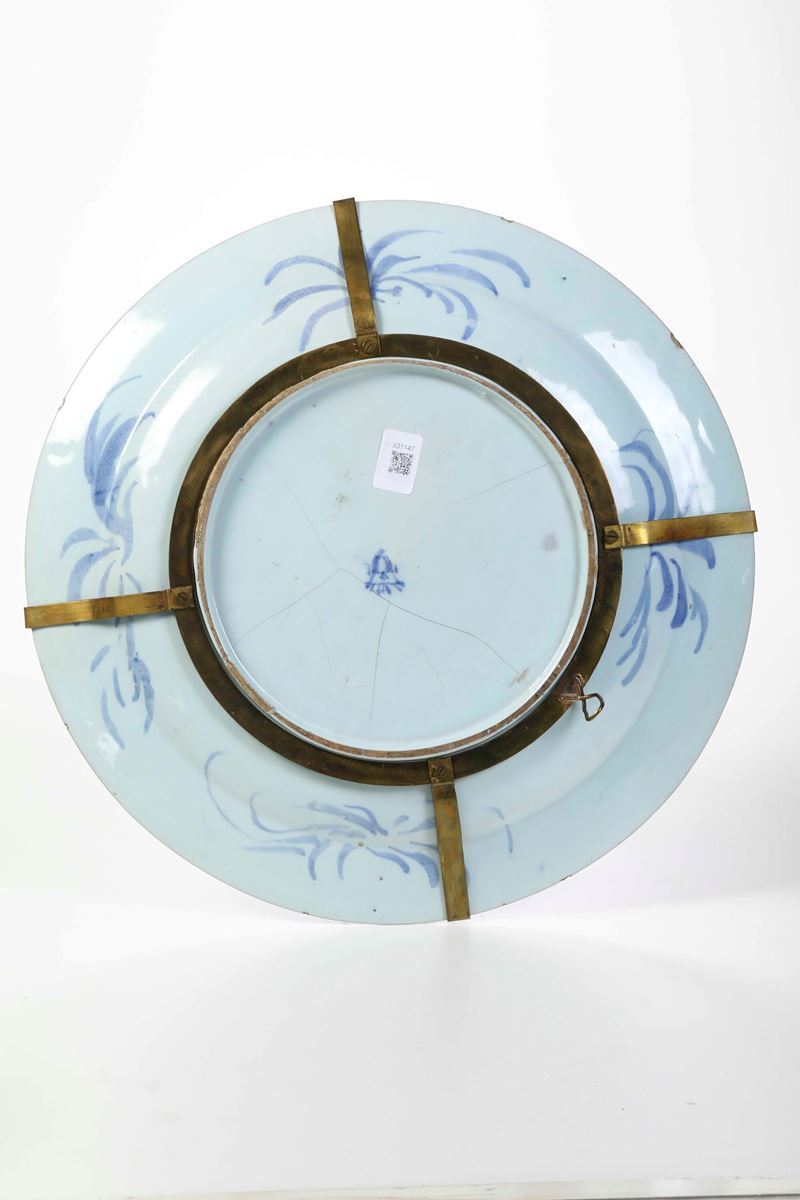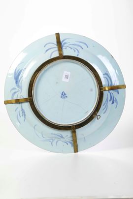 La decorazione della superficie posteriore del piatto consiste nella presenza di quattro cespi di foglie lanceolate, disposti in ordine simmetrico lungo la zona comune fra la tesa e l’ingiro. La marca Stemma di Savona dipinta in blu al centro del fondello accerta la produzione savonese della maiolica, nell’ottavo decennio circa del XVII secolo.