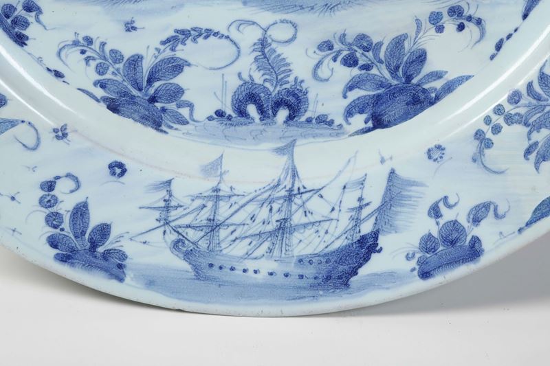 Il progetto decorativo risulta eseguito nella consueta monocromia blu su fondo azzurro a sfumatura di verde. Il soggetto dipinto sul cavetto s’inserisce nella trama dell’ornato vegetale “orientaleggiante a tappezzeria”, disposto lungo la tesa e sull’orlo interno del cavetto. Le figure di due galeoni evidenziano la linea ideale del diametro, ciascuno posto al rispettivo estremo e collocato nello spazio limitato dalla presenza di due cespi fioriti; il terzo galeone è alla fonda entro il colmo inferiore del cerchio della tesa, le nubi aderiscono a quello superiore.