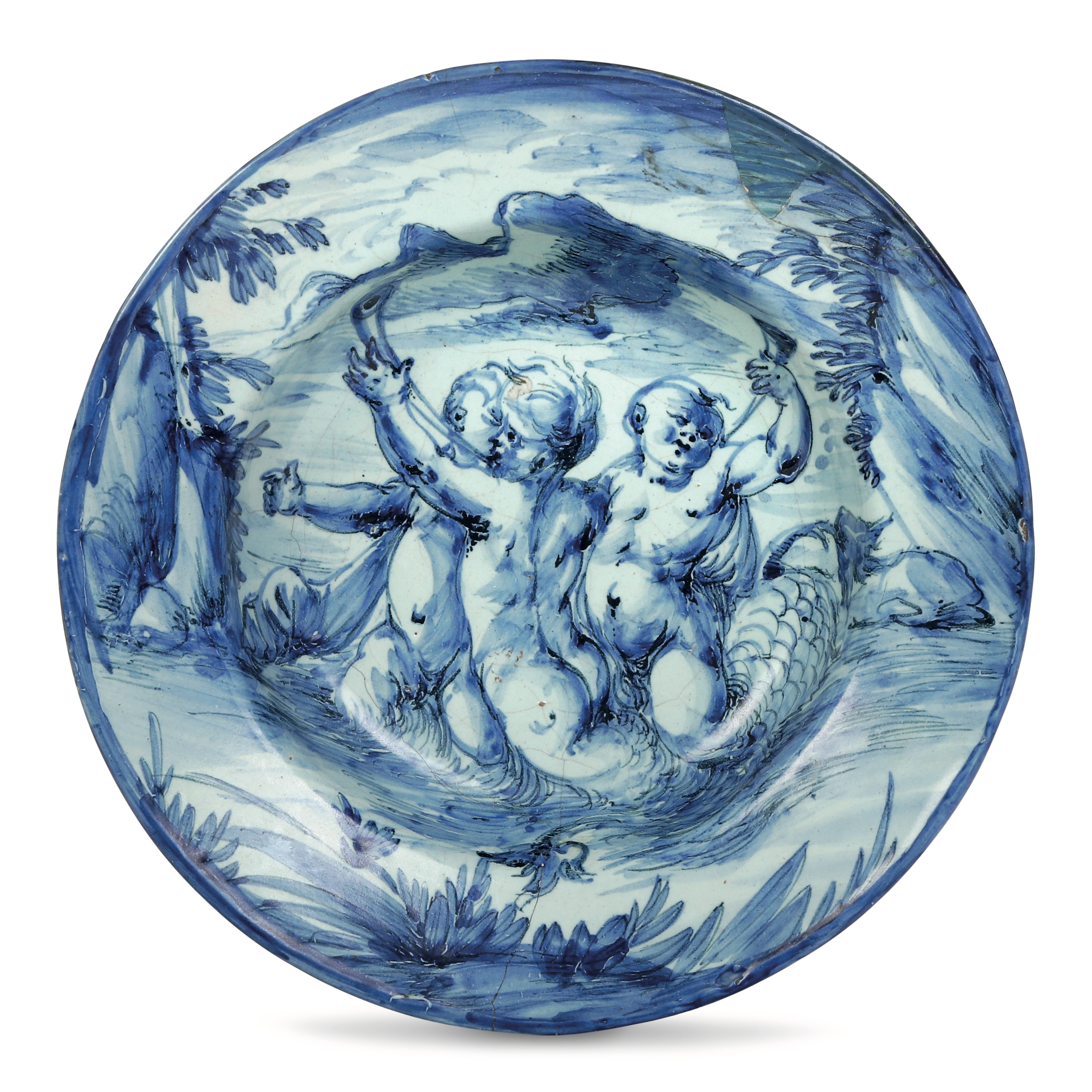 Il piatto fondo, dalla superficie azzurrina, è dipinto in monocromia blu sul recto con una scena istoriata che rappresenta, tra quinte rocciose, tre putti che suonano i corni mentre si trasformano in tritoni, sullo sfondo montagne. Sul verso, un decoro con ciuffi vegetali stilizzati