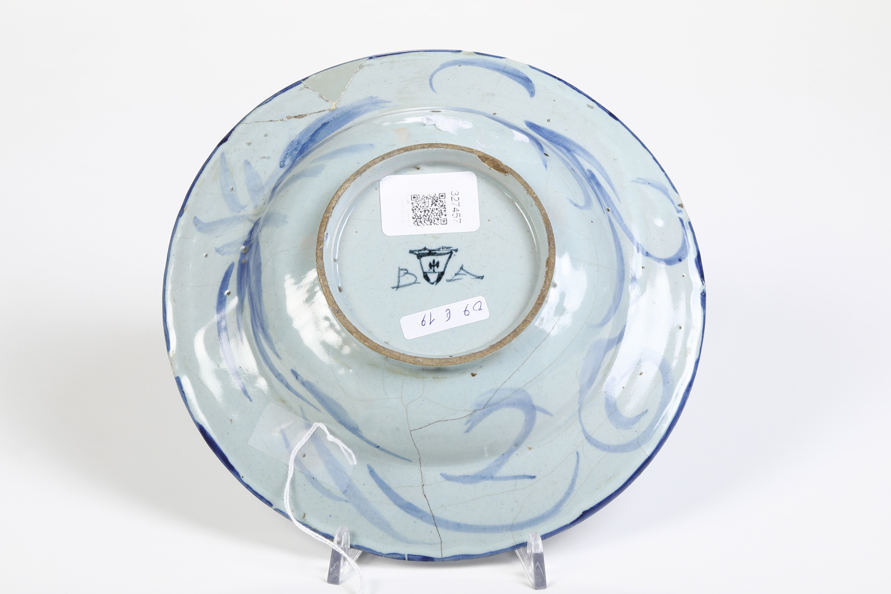 Maiolica. Marca: stemma di Savona con lettere “BA”. Dimensioni: altezza cm 5; diametro cm 22. Conservazione: rottura sulla tesa alle ore 13 in parte integrata; felatura alle ore 18 che scende verso il cavetto