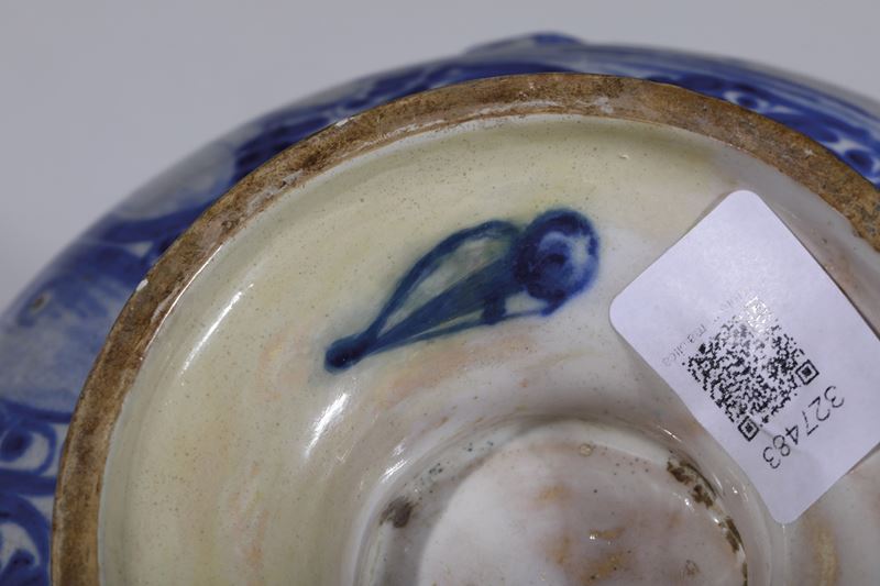 Maiolica. Marca: Lanterna in blu. Altezza cm 21; diametro massimo cm 25. Conservazione: sbeccature e mancanze riprese in vecchio restauro al piede, al bordo superiore e alle prese