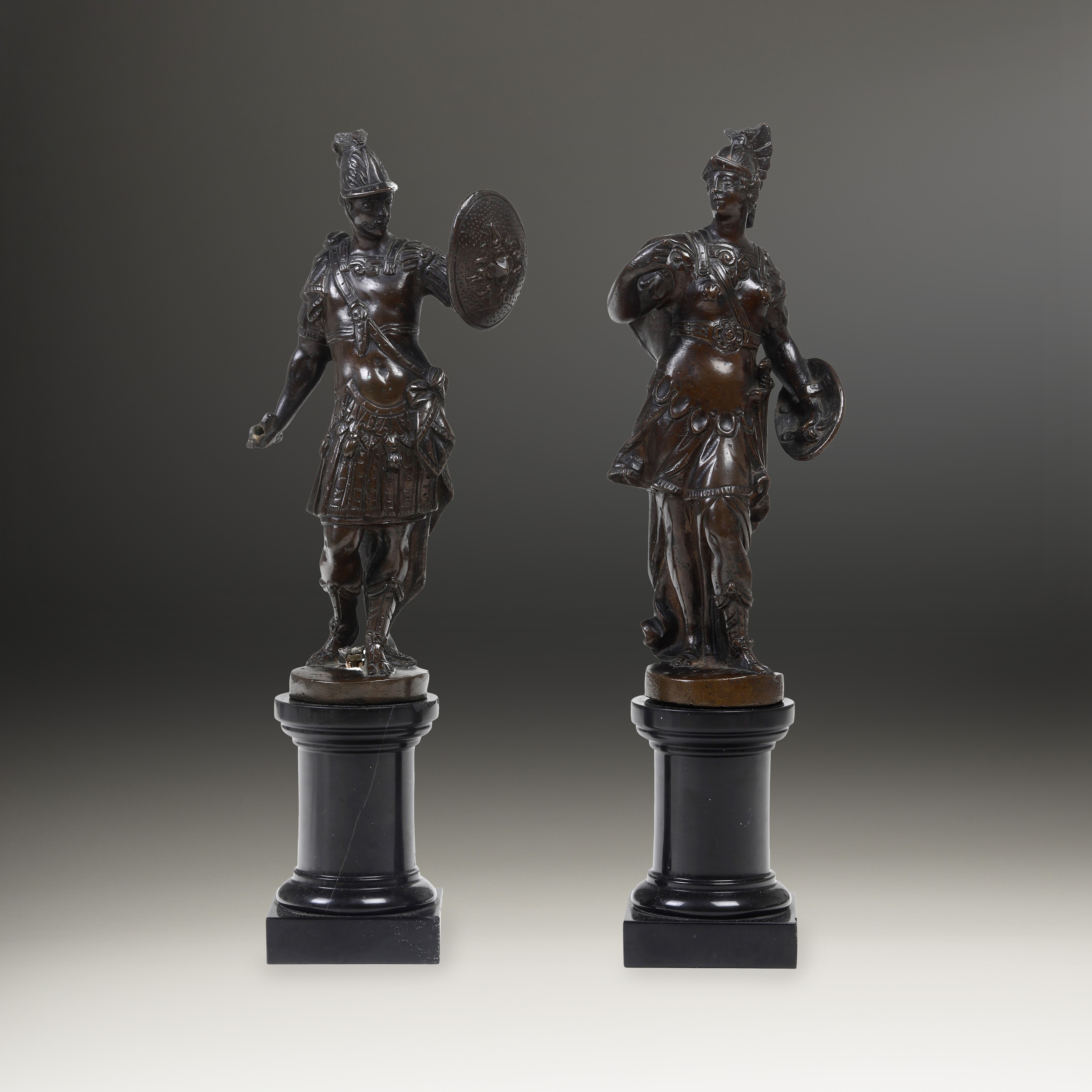 Bronzo fuso e patinato. Basi in legno tornito ed ebanizzato non coeve