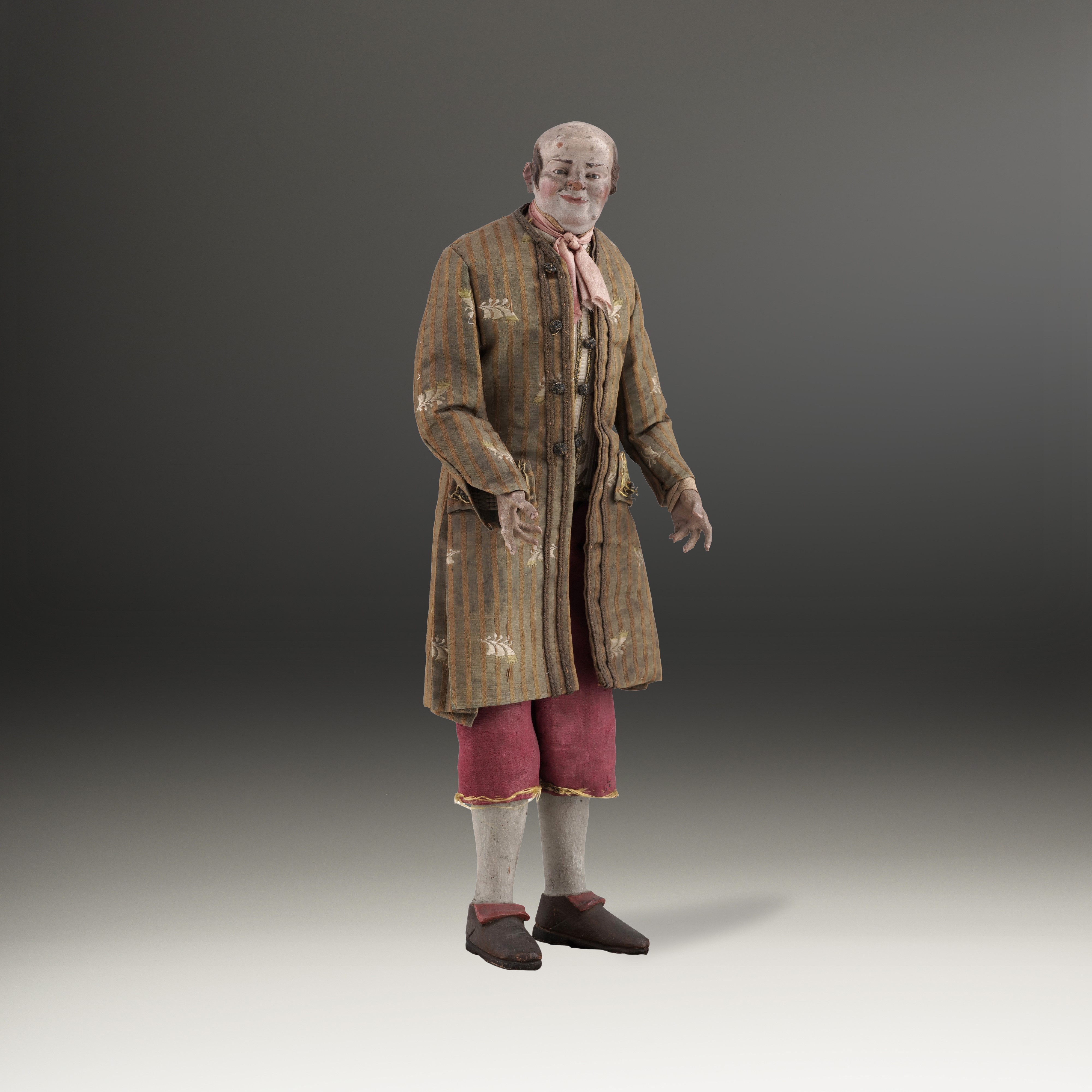 Figura da presepe con mani e testa in terracotta, occhi di vetro, abiti in tessuto.