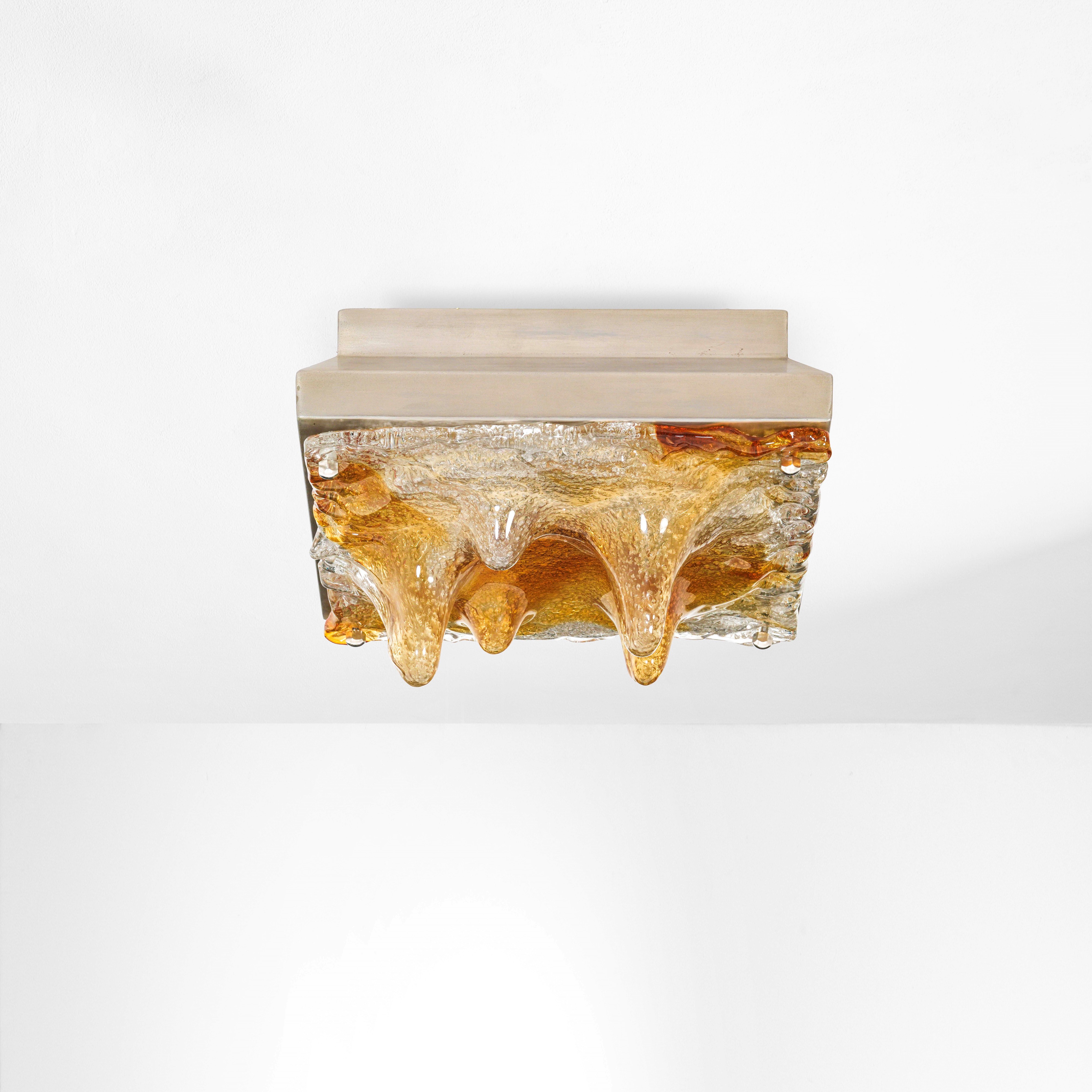 Struttura in metallo cromato, diffusore in vetro di Murano colorato a bollicine.