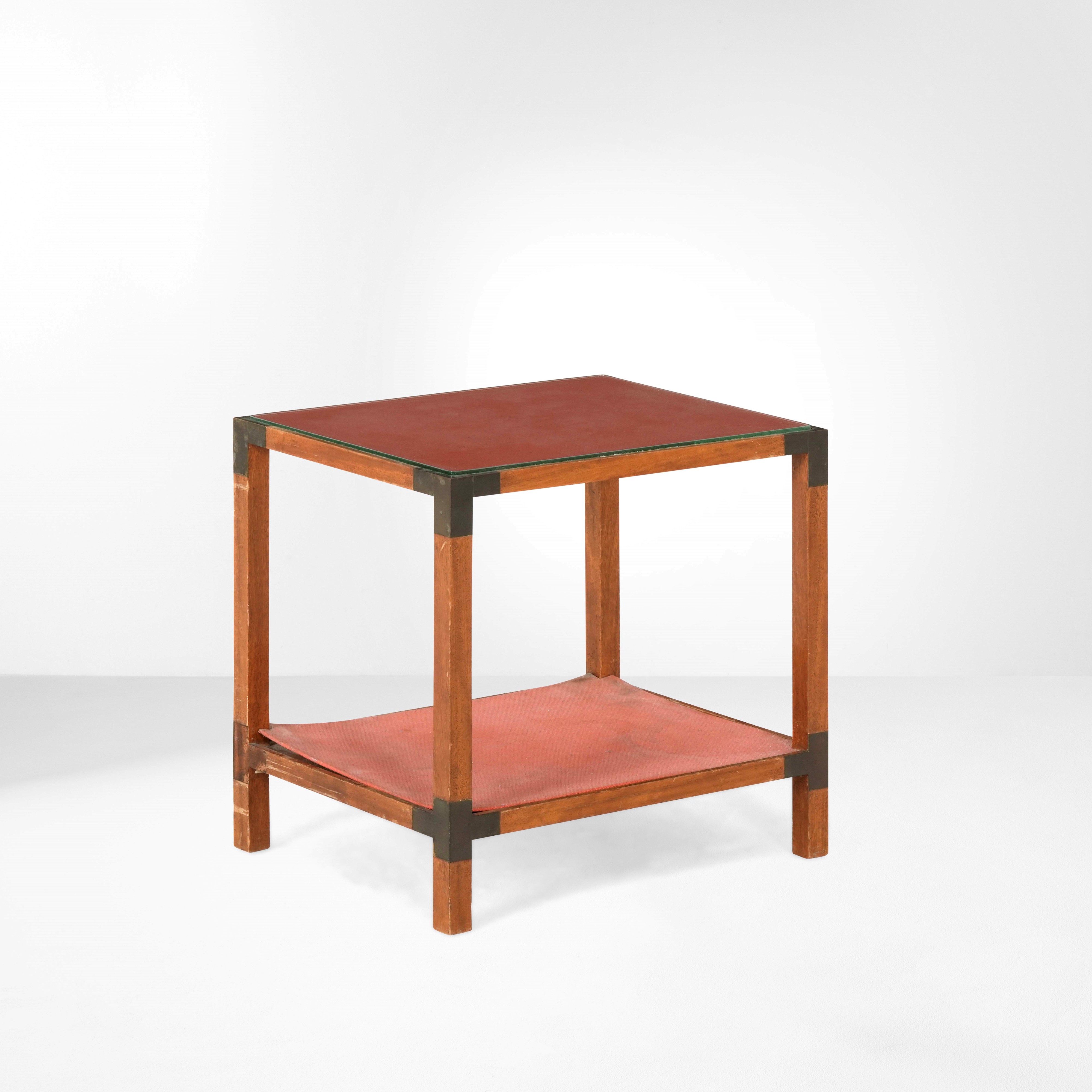 Struttura in legno, rivestimento in tessuto, piano superiore in vetro molato e dettagli in ottone.