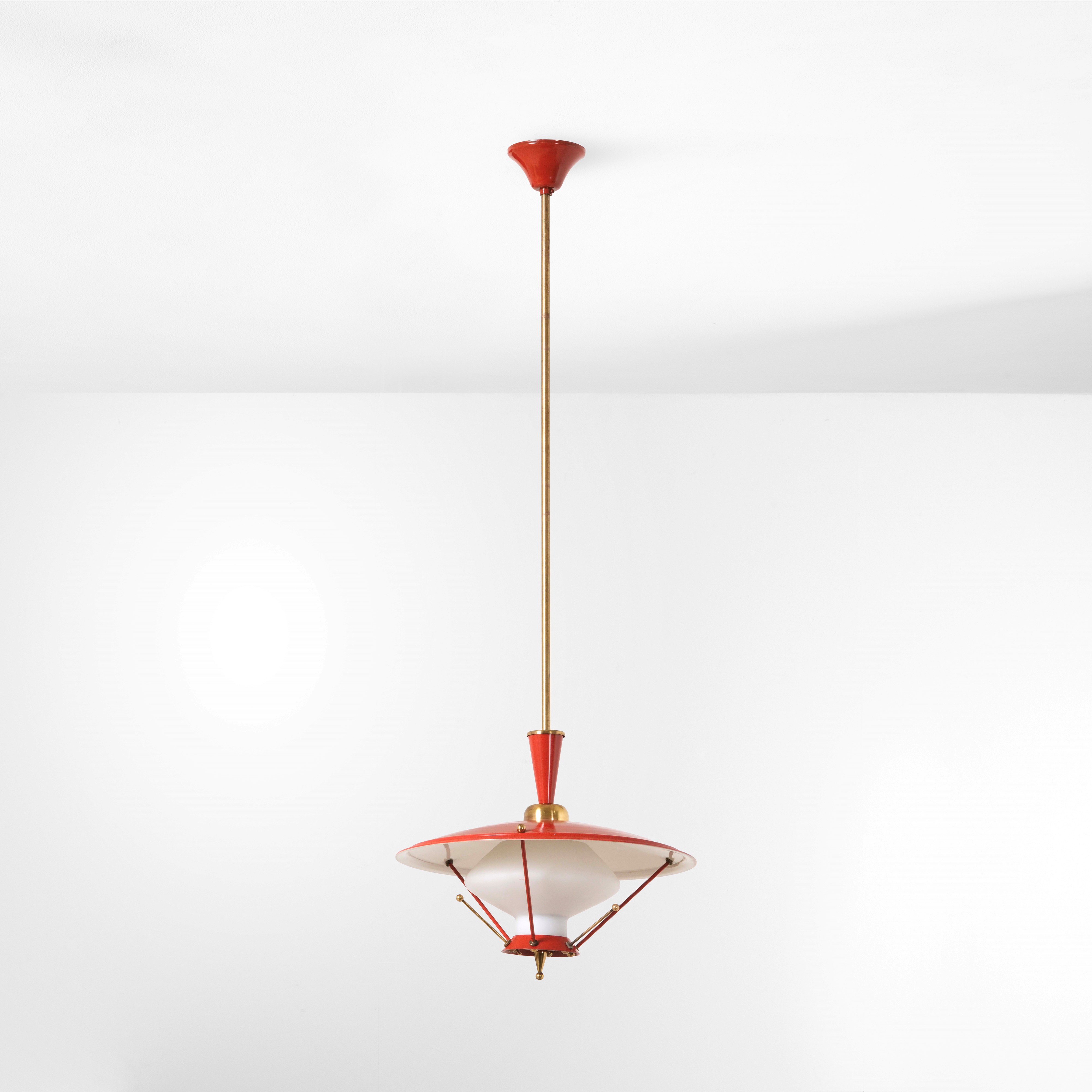Struttura in ottone e metallo laccato con diffusore in vetro opalino.