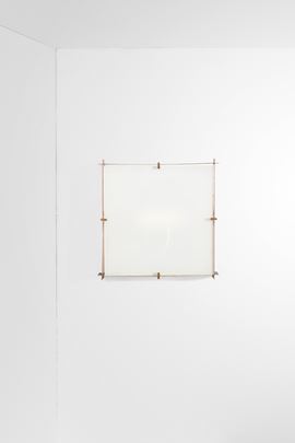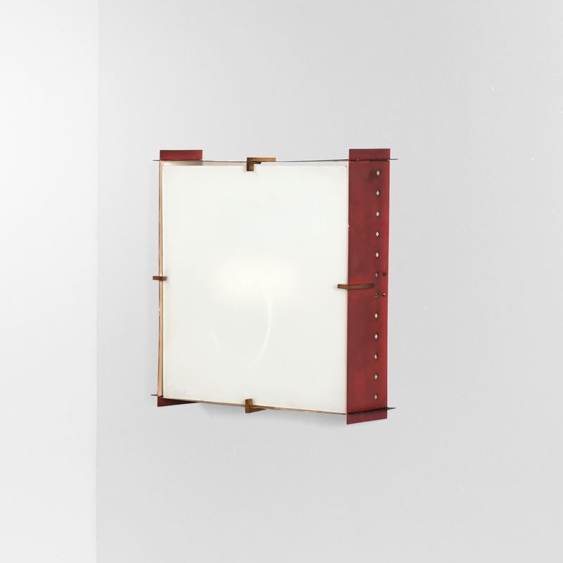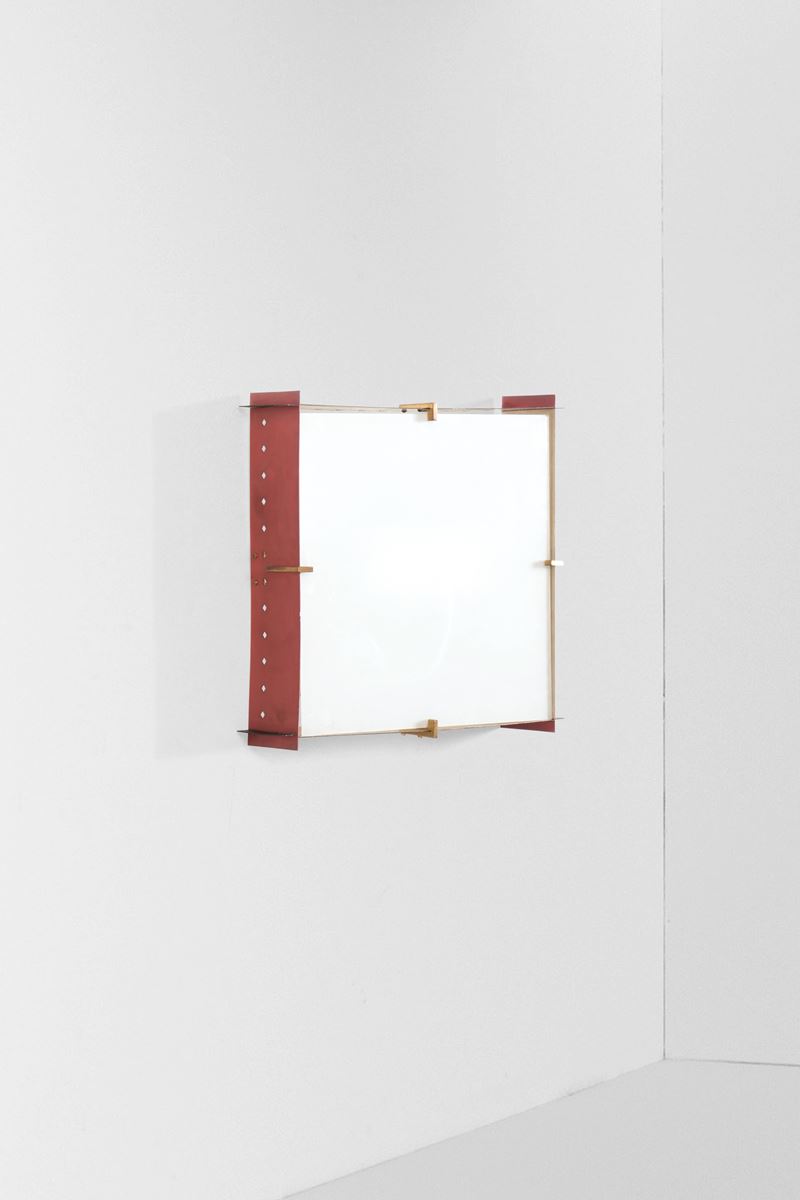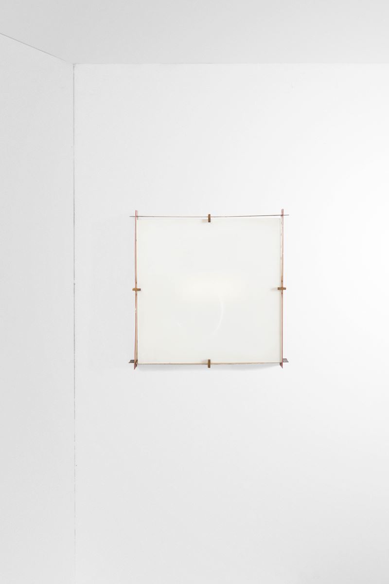 Struttura in metallo laccato con fermi in ottone e diffusore in vetro satinato.