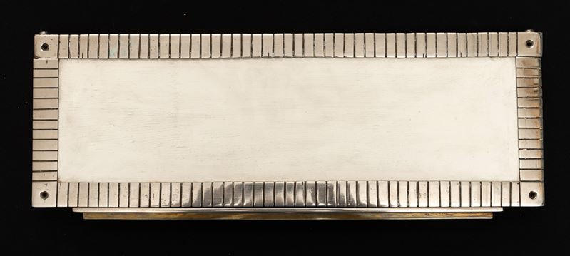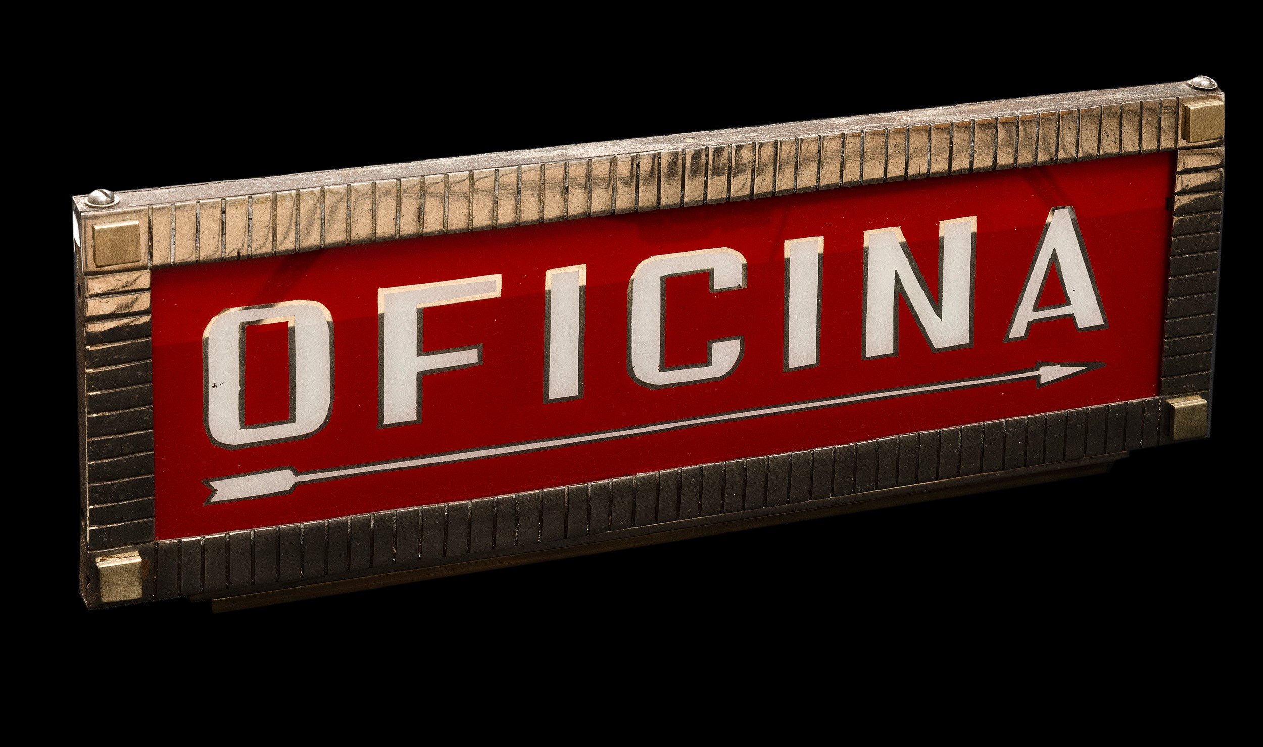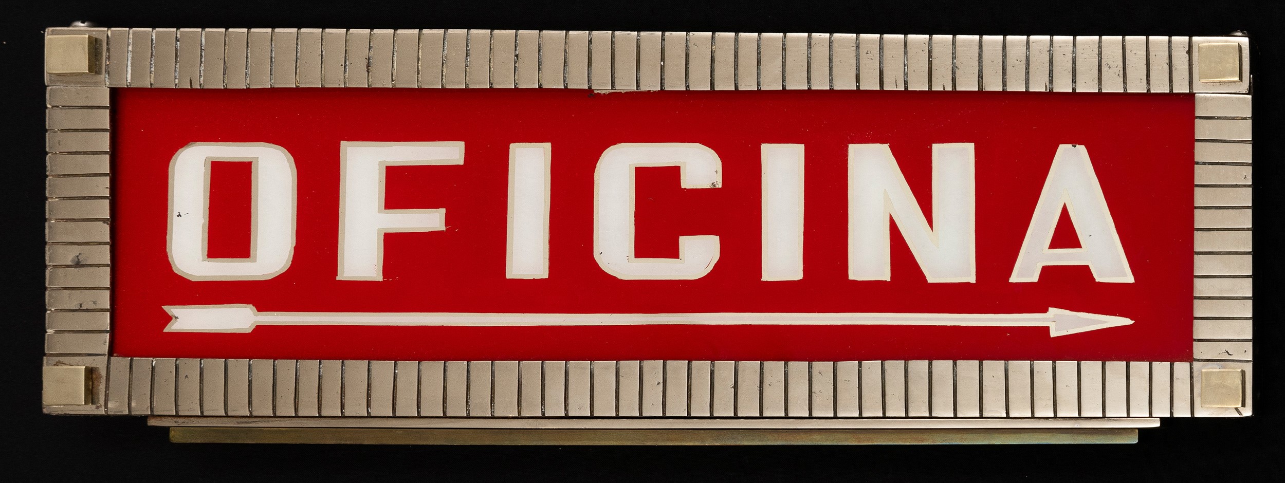 Vetrofania con cornice in metallo, 1950 ca. Cm 50 x 17 x 2. Segni del tempo.