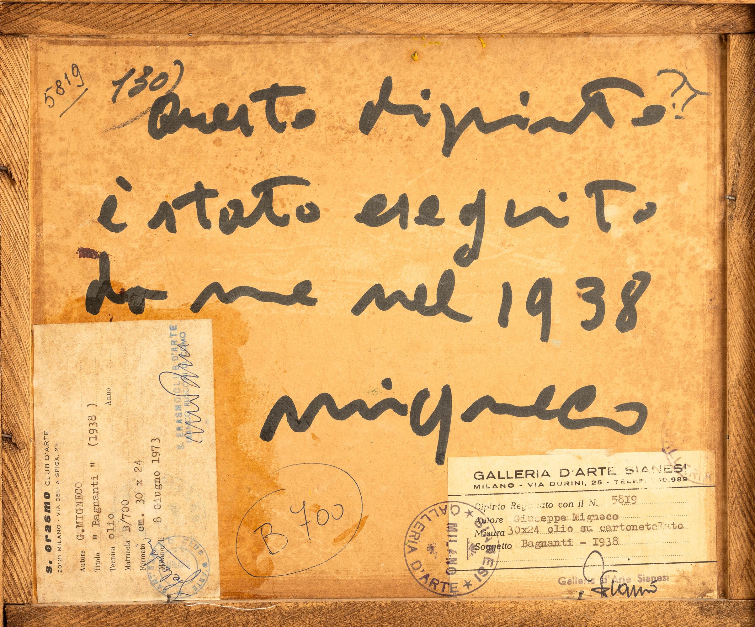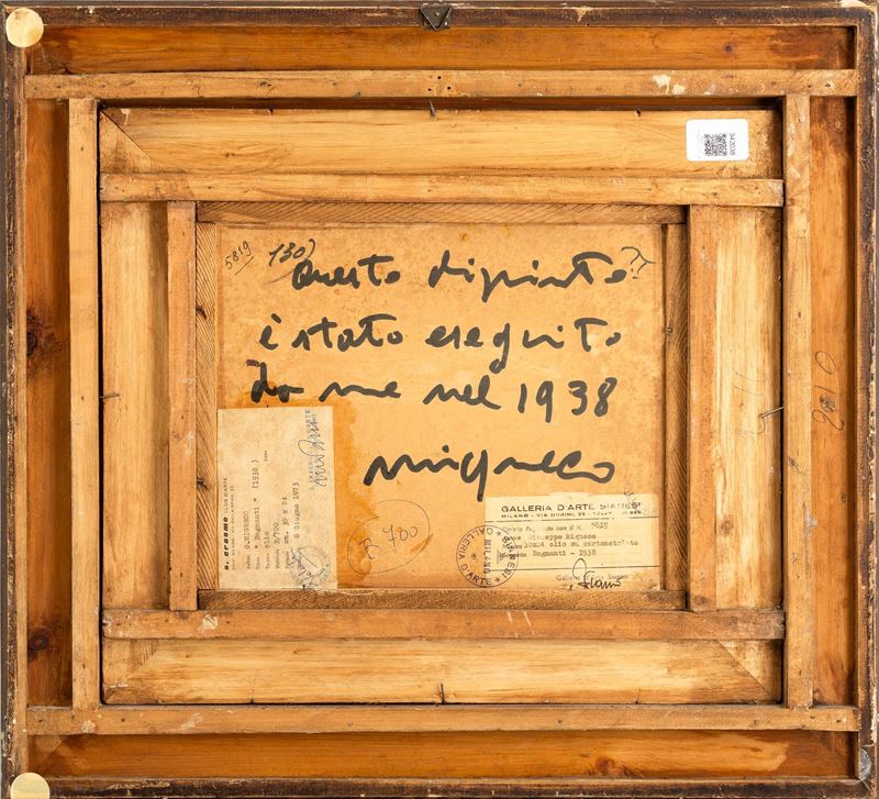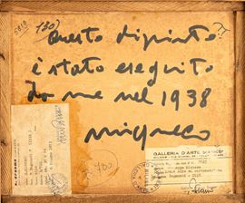 Al retro etichette cartacee della Galleria d'Arte Sianesi di Milano e della Galleria S.Erasmo, Milano