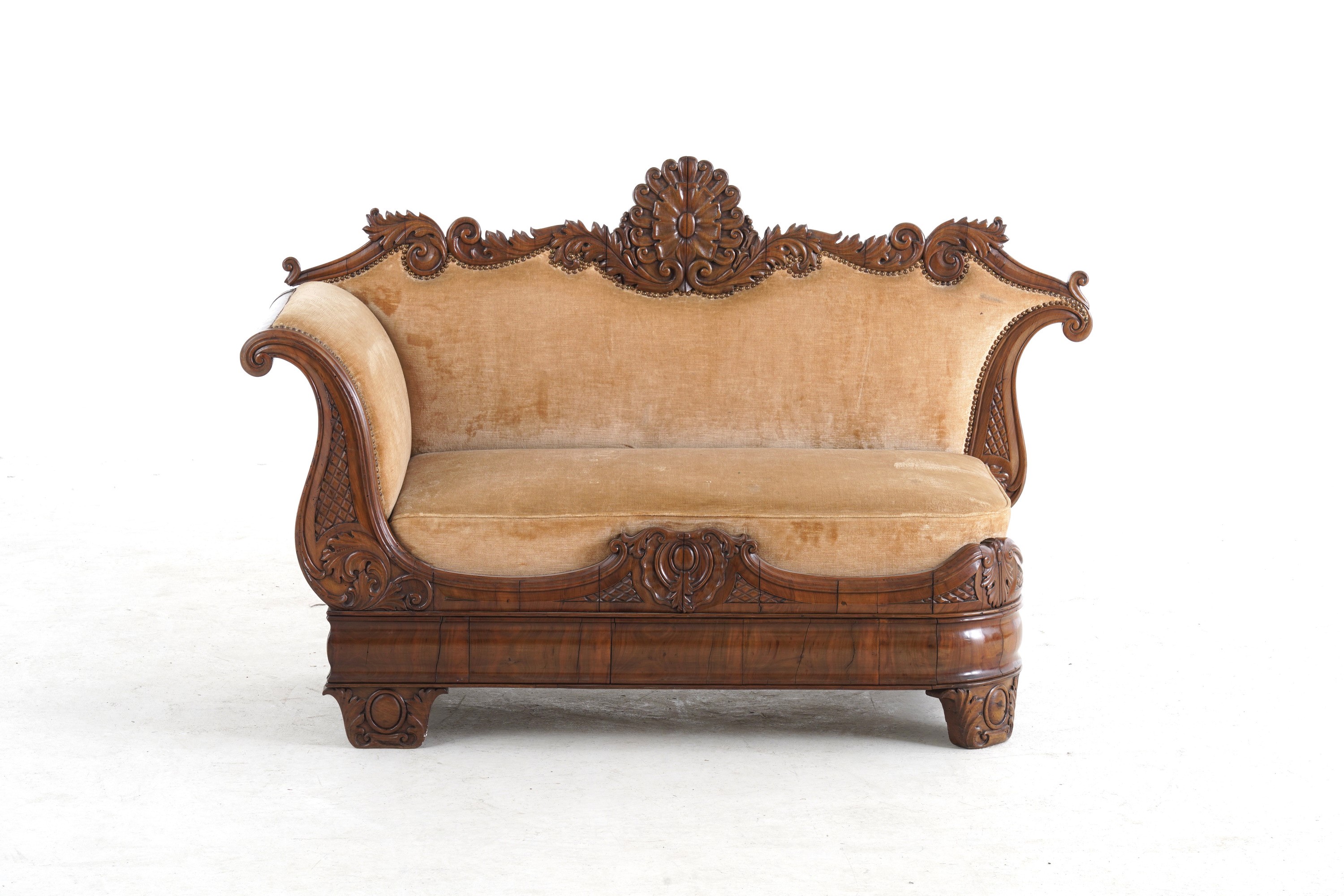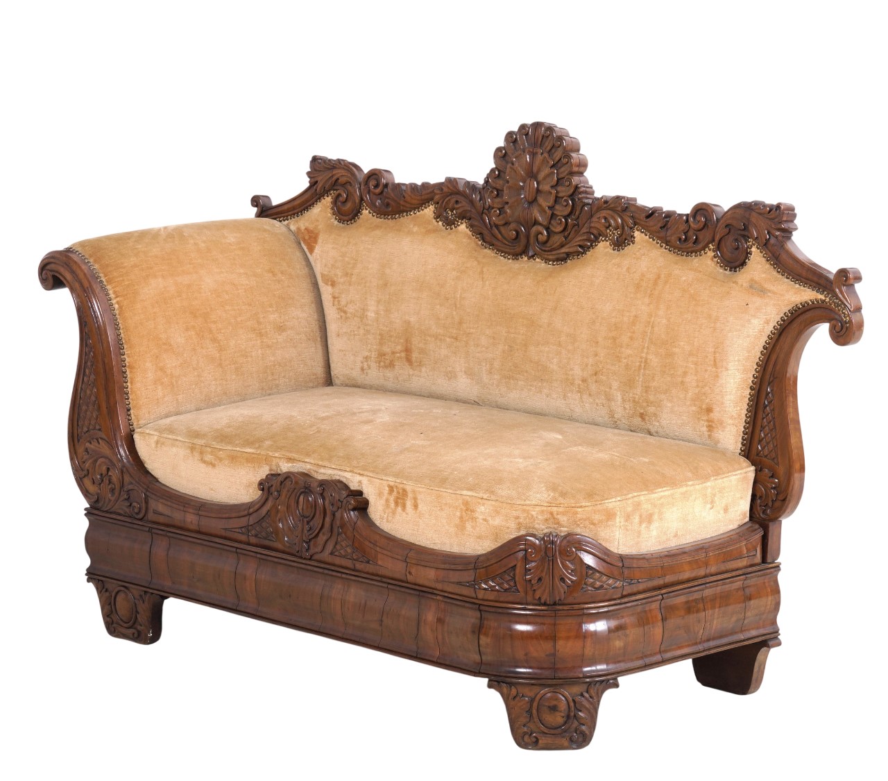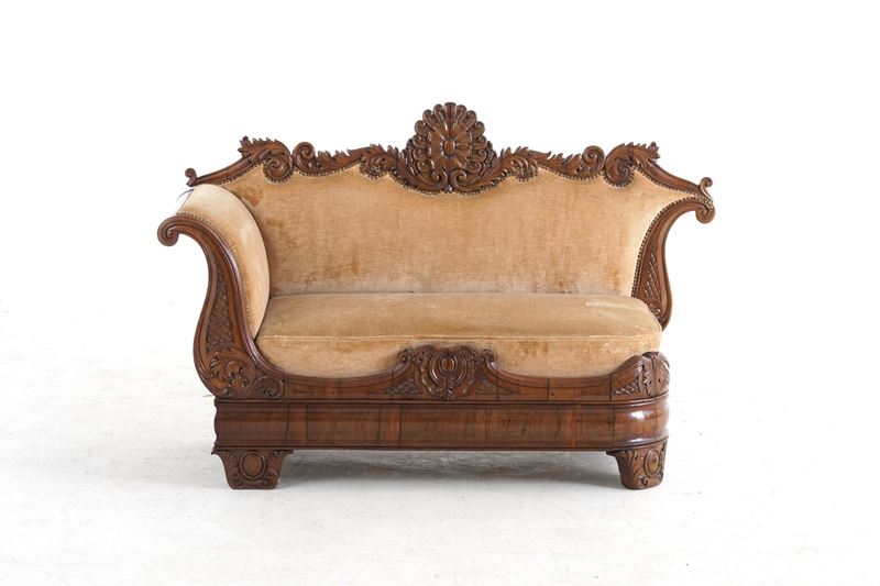 Seduta, schienale e bracciolo imbottito, decori floreali e fogliacei