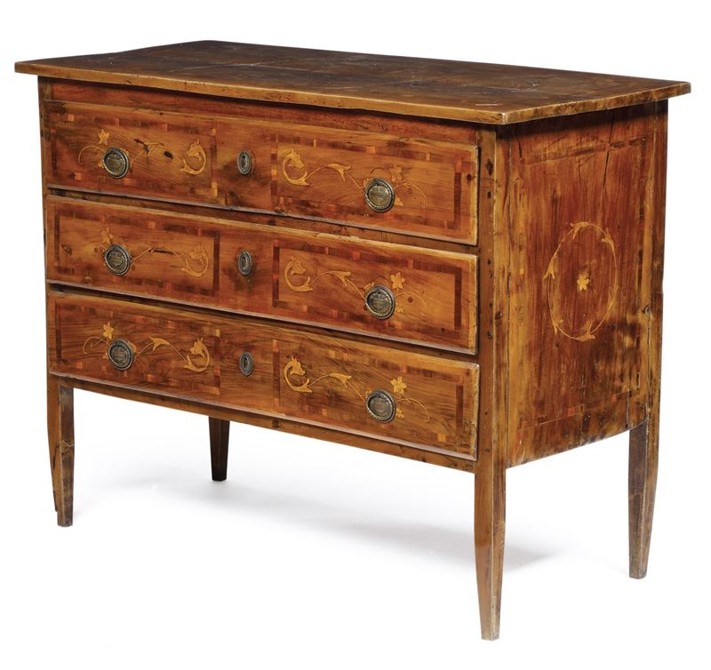 Gambe rastremate, fronte a tre cassetti, filettature in legno scuro e intarsi floreali