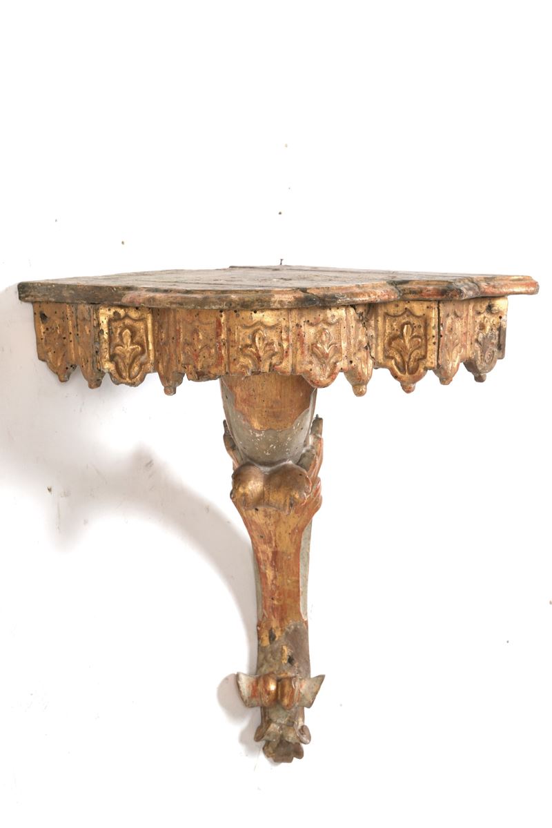 Coppia di mensole angolari in legno intagliato, laccato e dorato. XVIII secolo