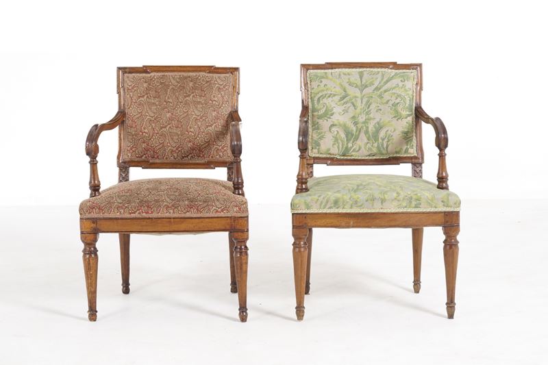 Coppia di poltrone Luigi XVI in noce intagliato. Fine XVIII secolo