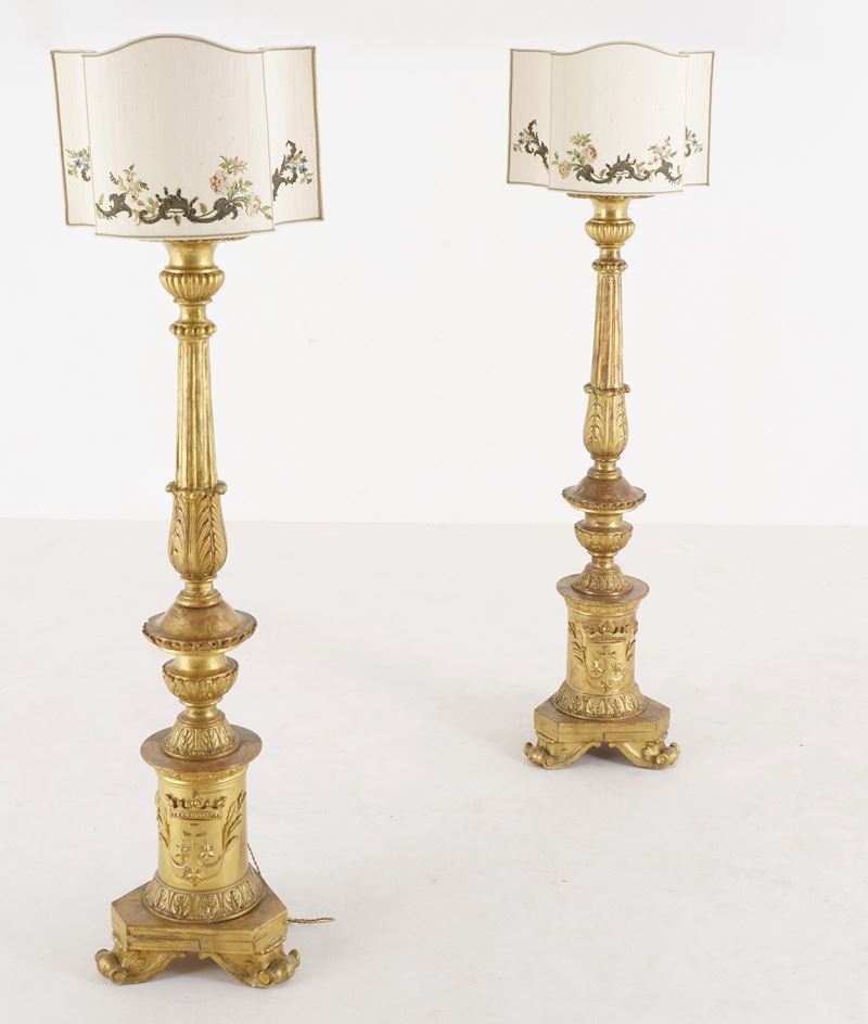 Coppia di torciere in legno intagliato e parzialmente dorato. XIX secolo