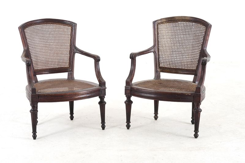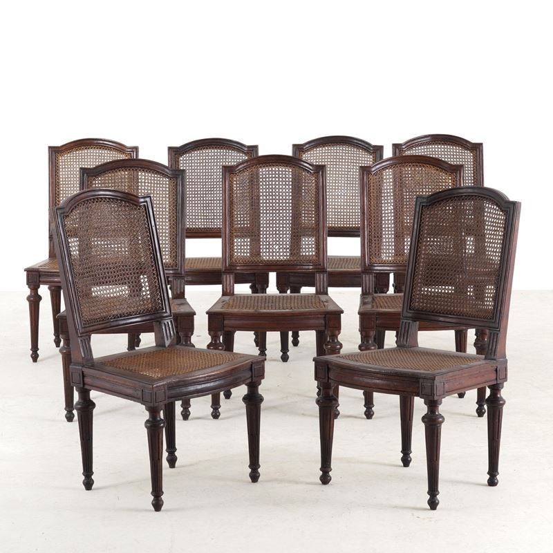 Lotto di nove sedie e due poltrone in noce. Fine XVIII secolo
